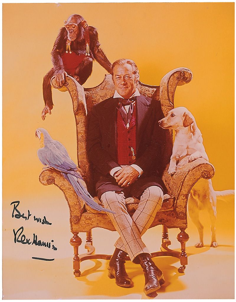 Color glossy 8 x 10 photo of Harrison surrounded by animals as Dr. Doolittle, signed in black felt tip “Best wishes, Rex Harrison.” In fine condition, with a spot to the finish along the top edge.
