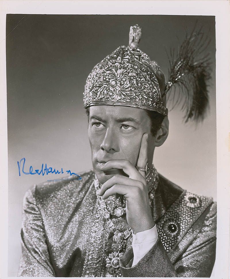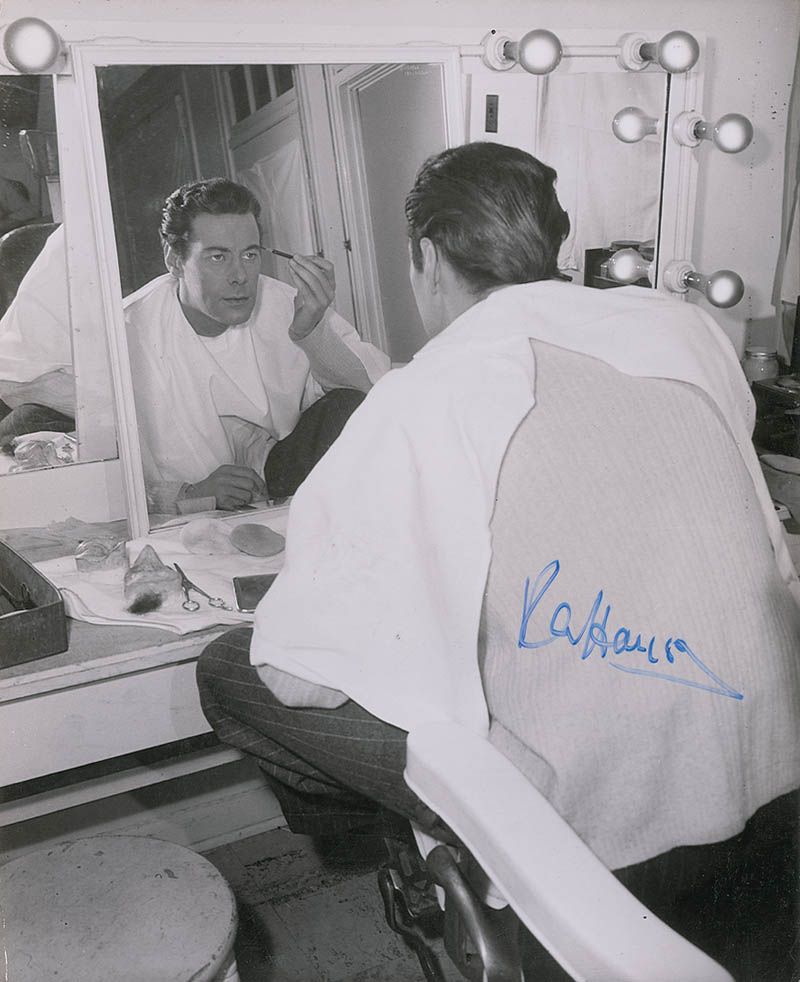 Two signed photos: glossy 8 x 10 of Harrison applying his make-up, signed in blue felt tip; and an 8 x 9.25 photo of Harrison in an elaborate jacket and hat, also signed in blue felt tip. In very good condition, with trimmed edge to one photo, as well as a moderate horizontal crease, and scattered surface marks to both.