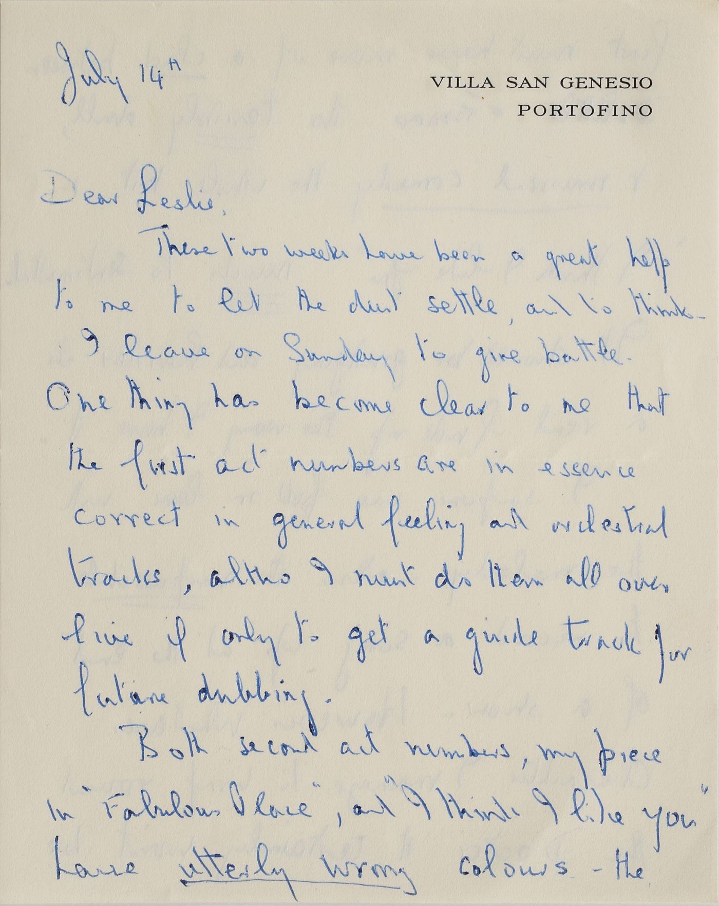 Amusing ALS signed “Rex,” four pages on two sheets, 6.25 x 8, Villa San Genesio letterhead, July 14, [1967]. Letter to composer Leslie Bricusse, in part: "One thing has become clear to me that the first act numbers are in essence correct in general feeling and orchestral tracks, altho I must do them all over…Both second act numbers, my piece in 'Fabulous Place,' and 'I think I like you' have utterly wrong colours—the first must have more of a clash between Dolittle & Emma it's terribly dull & musical comedy the whole bit & 'I think I like you' much too sentimental. It should be grudging and harder its a real fuck up the way I have it. I suppose we fell in love with the melody." In fine condition.
