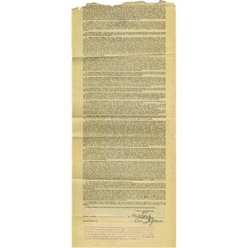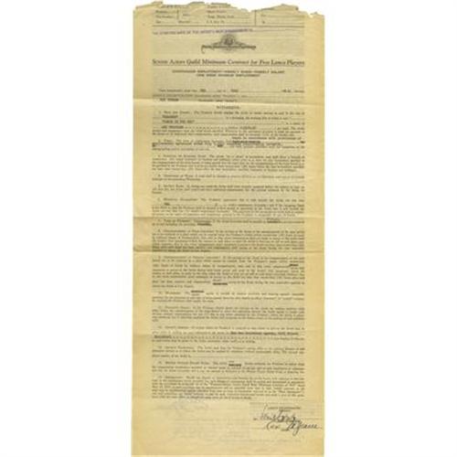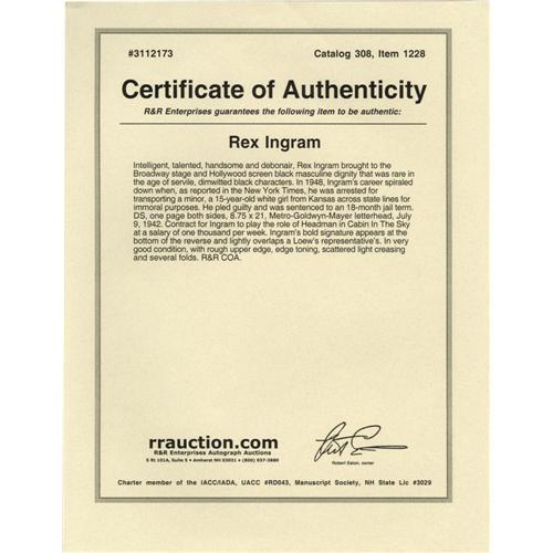 <B>Rex Ingram Signed Contract.</B></I> Rex Ingram (1895-1969) was a wonderfully commanding African-American actor who played everything from "De Lawd" (aka God) in <I>The Green Pastures</B></I> (1936) to "Lucius Ferry" (aka Lucifer Jr.) in <I>Cabin in the Sky</B></I> (1943). This is Ingram's <I>Cabin in the Sky</B></I> contract, a double-sided, one-page pact on MGM letterhead, dated July 9, 1942, and signed by the groundbreaking African-American actor in black ink. A great memento from a superb talent in one of his pivotal roles. In Very Fine condition with light edge wear, tanning, and creasing, and a few fold creases. <I>Accompanied by a certificate of authenticity.</B></I><I>Accompanied by LOA from PSA/DNA.</B></I><BR><BR><b>Shipping:</b> Small Flat (<a target="_blank" href="http://www.heritageauctions.com/common/shipping.php">view shipping information</a>) <BR><BR><B>Important notic