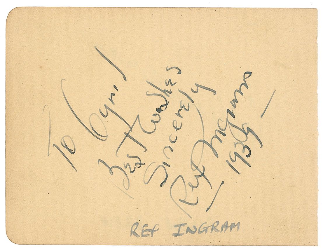 Vintage fountain pen signature and inscription, “To Cyril, Best Wishes, Sincerely, Rex Ingram, 1939,” on a beige 5 x 4 album page with an ink notation below the signature. In fine condition, with light show-through from a signature on the reverse.