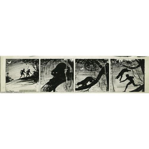 <B>Rex Maxon - Tarzan Daily Comic Strip Original Art, dated 12-11-34 (United Features Syndicate, 1934).</B></I> In March 1929, Rex Maxon succeeded Harold Foster as the artist on the daily <I>Tarzan</B></I> comic strip, and drew the series for the next 18 years. As a pioneer into the uncharted "adventure" section of the funny papers, Maxon brought a fine art touch to the Lord of the Jungle, as can be seen in this atmospheric daily from November 11, 1934. Working from the script writer's text, he brings a moody, other-worldly quality to these four wordless frames. The art measures 21" x 5" and is in Excellent condition. <BR><BR><B>Important notice:</B> Heritage usually auctions material at the rate of 200-250 lots per hour. On some occasions eBay Live bid software or the Internet may not be able to keep up with the pace of the auction. We recommend placing a realistic absentee bid now as insurance to avoid disappointment. Occasionally the auctioneer may eliminate or reject an eBay Live bid, and the auctioneer may also reopen a lot after the close of the eBay live bidding (usually because we missed an audience bid), and may reject your bid even if it shows you as the winning bidder. By bidding via eBay Live, you agree that Heritage may award the lot to another bidder at its sole discretion under the circumstances described above or any other reasonable circumstances. Since eBay bids are not shown to us until we open the lot on the floor, we treat those bids just like floor bids. In most cases the floor responds before the eBay bid is presented to us, due to Internet lag time, so for consistency we have made it a policy that floor bids are always considered first over tie eBay live bids. Also please note that all Heritage lots purchased through eBay Live carry a 22.5% Buyer's Premium. Please make sure you read the Terms and Conditions before you bid. This lot is being auctioned in conjunction with a live floor auction by Heritage Auction Galleries. All final auction and invoice information will be supplied by Heritage Auction Galleries, and all other information should be considered preliminary. Lot:41001 <BR><BR><B>Winning Notification and Billing:</B> After the FINAL session in this auction is complete, Heritage will send e-mail and snail mail invoices. This process normally takes several days. All final auction and invoice information will be supplied by Heritage Auction Galleries, and all other information should be considered preliminary. <BR><BR>This auction will be conducted on a live auction floor and over the Internet through eBay Live. If you choose to place an absentee bid, please take a moment to <font color='#0000ff'><u><a href='http://pages.ebay.com/liveauctions/help/before/laabsentee.html'>learn how eBay Live absentee bidding works</a></u></font><font color='#000000'>