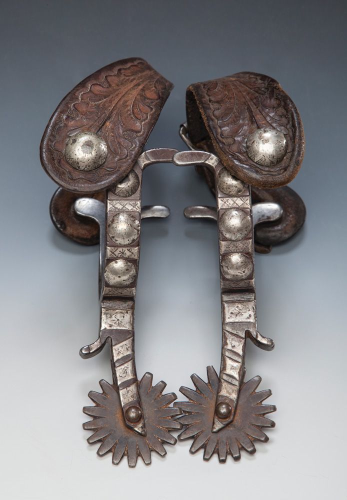 Rex Schnitger Spurs. Exemplary double-mounted Red Schnitger Wyoming spurs with Rex's trademark Cheyenne split heelband, three (3) raised star-pattern engraved silver domes separating inlaid & engraved 3/4" wide silver bands, 2 3/4" pointed shanks. Circa 1920, evenly worn with a fine, soulful ranch appeal. .