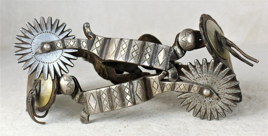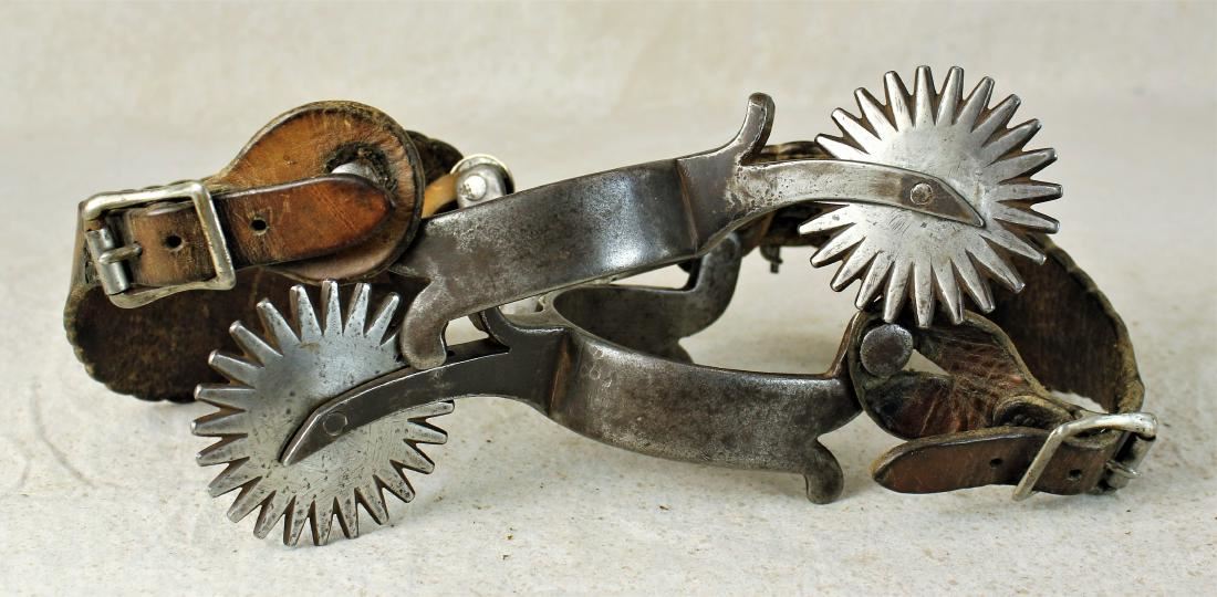 Fantastic over sized spurs single mounted with heavly engraved silver, split heel bands, huge rowels and great original straps.