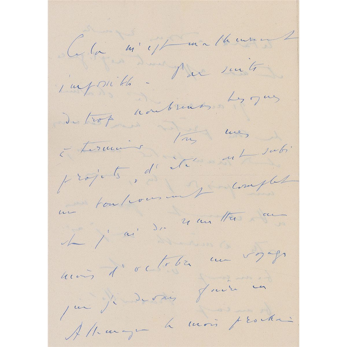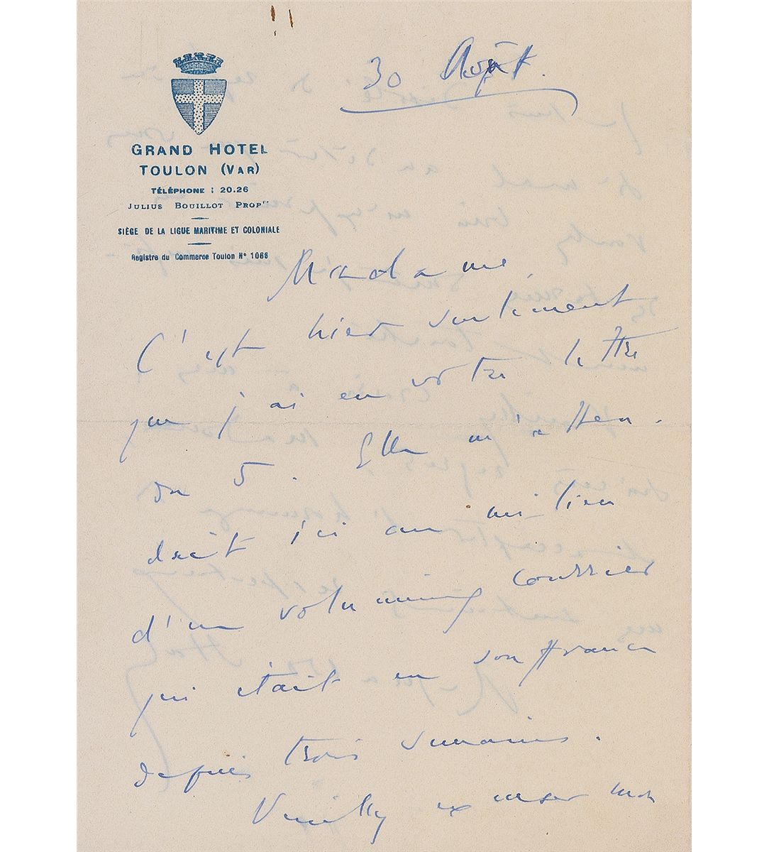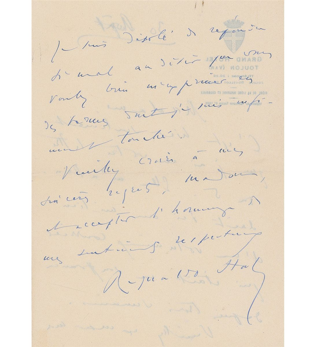 Venezuelan composer, conductor, music critic, and theatre director (1874–1947). ALS in French, four pages on two adjoining sheets, 5 x 7, Grand Hotel Toulon letterhead, August 30. Untranslated letter to a friend. In fine condition, with central horizontal and vertical folds, and a couple of paperclip notations along top edge.