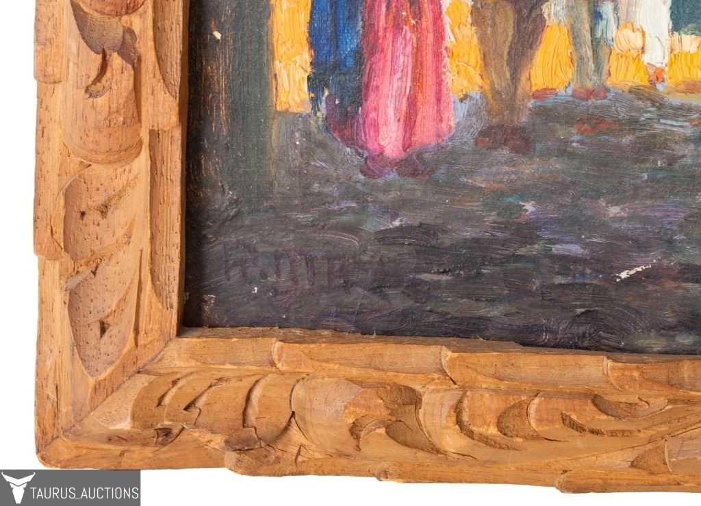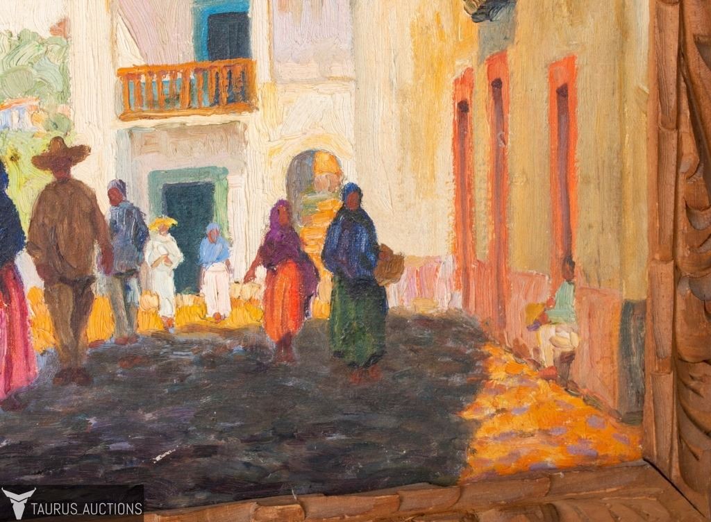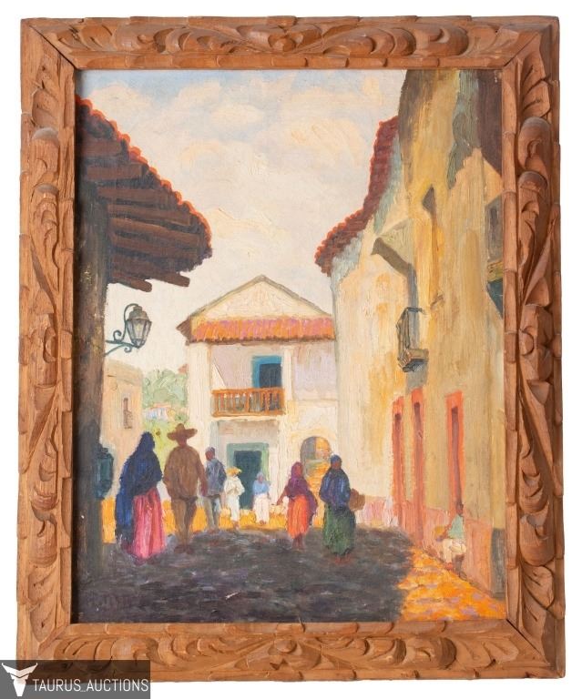 Item/Description: Rural landscape scene features figures in colorful clothing walking on a cobblestone street. Nice use of shadows and light. Signed lower left: R. Maya. Hand carved wood frame.