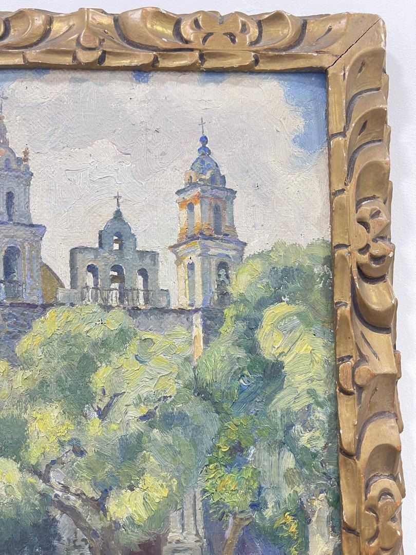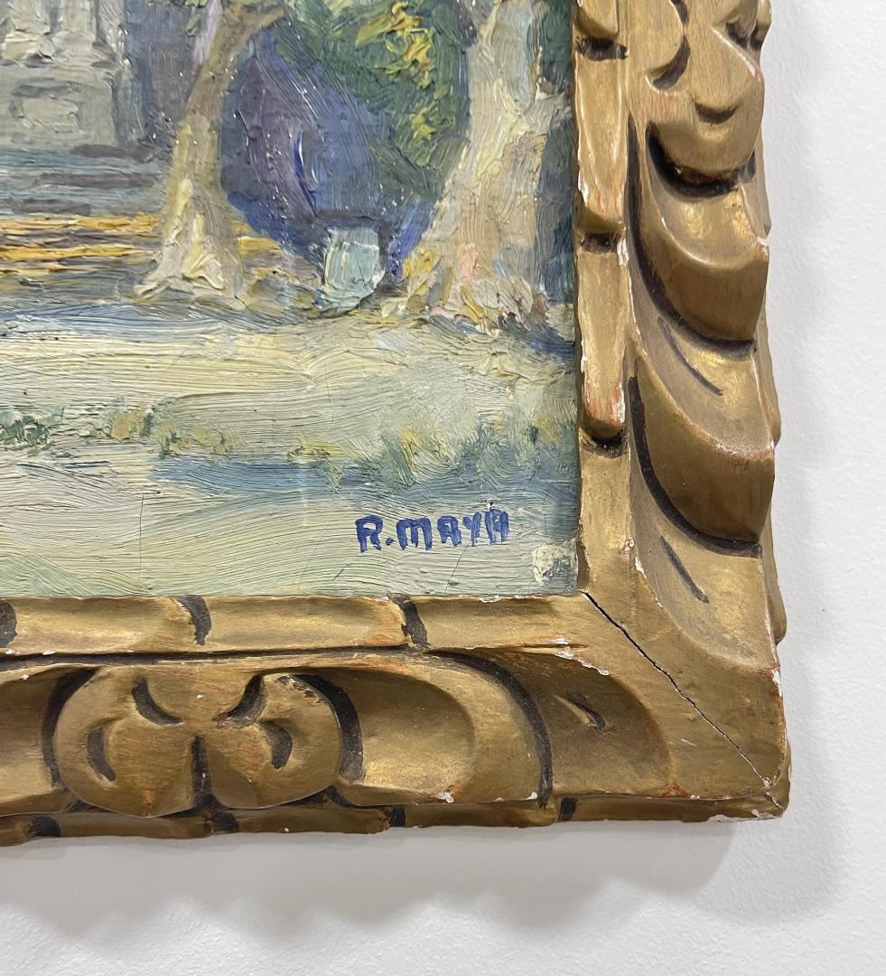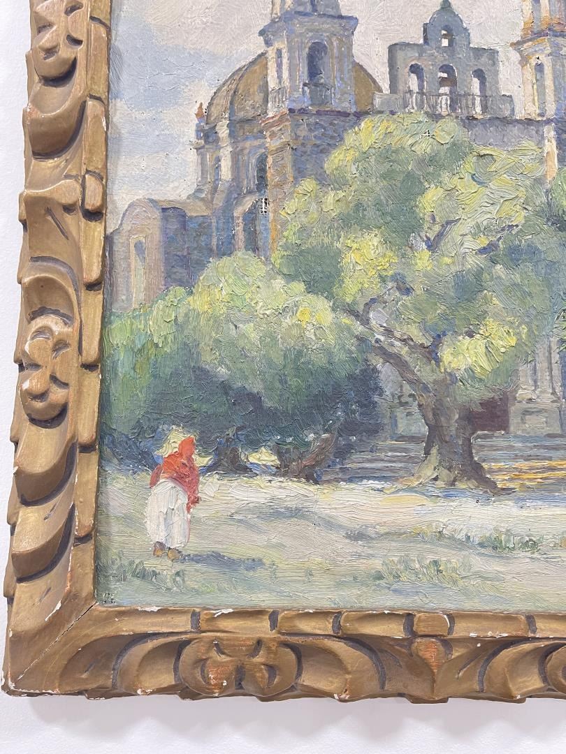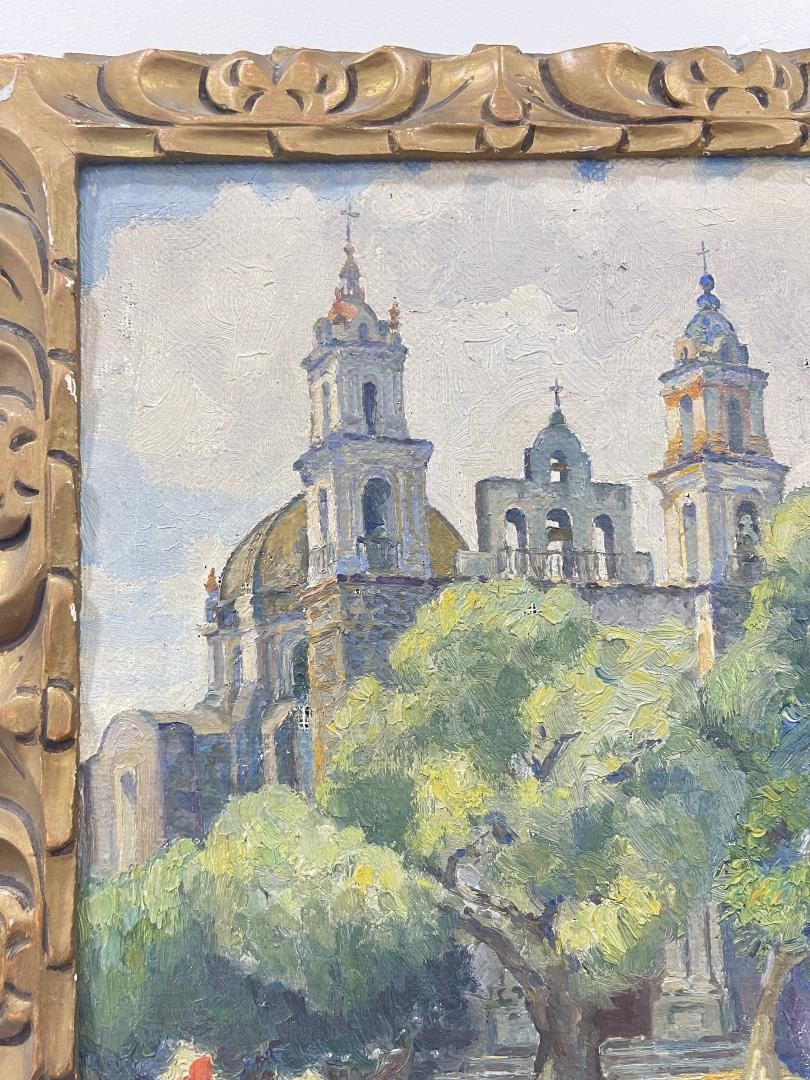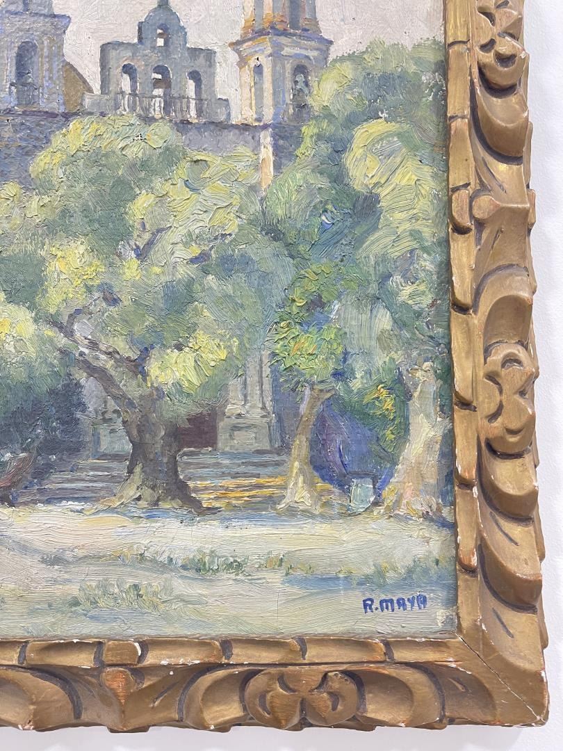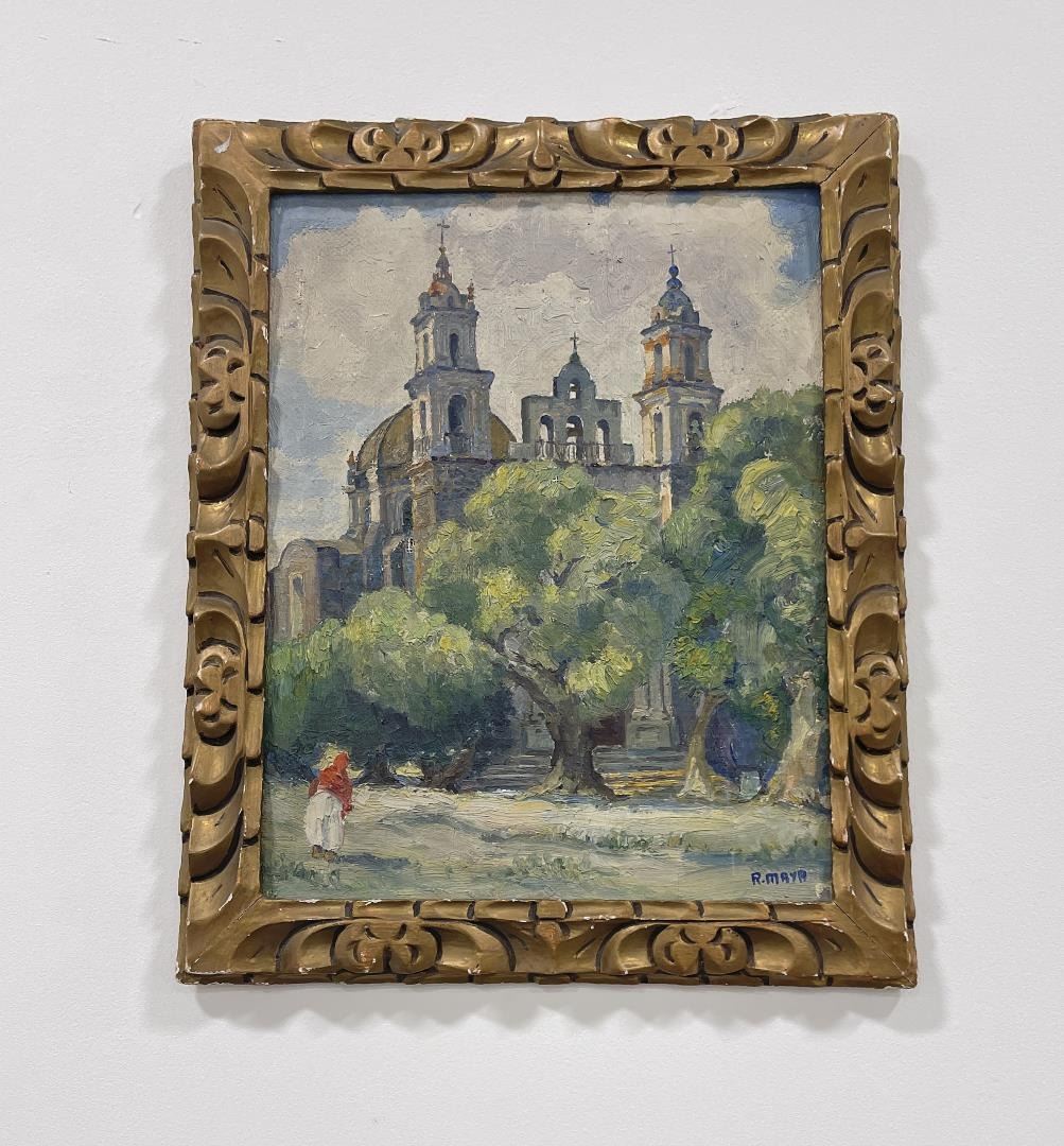 Artist is Reynaldo Maya. 13.5" by 16" framed. Mexican Artist’s Paintings to be shown in El Paso. An informal exhibition of paintings by Reynaldo Maya, Mexican artist, will be held at 7:30 p.m. tomorrow, at the home of R.L. Andrews at 1605 Alabama street. The exhibition will be a preview of a display of Mr. Maya’s paintings which will open next week in San Francisco. The public is invited. Mr. Andrews will leave here Friday to arrange for the exhibition at the Graves Gallery there. Mr. Andrews met Mr. Maya while vacationing in Mexico several years ago. Mr. Maya’s paintings have been on display in Paris, Madrid and Mexico City. In Madrid Mr. Mayo was presented a silver medal and diploma for his work. Mr. Maya, 38, is the son of a sarape weaver. He was born in San Miguel Topilejo, Near Mexico City. He began painting at five, and when he was in grammar school, he illustrated lessons on the blackboard for both students and teachers. Some of the paintings to be on exhibition were completed by Mr. Maya recently in a temporary studio in Juarez. His paintings are of rural Mexico landscapes and character studies. Source: El Paso Herald (Newspaper) (El Paso, Texas) 01 Jul 1947. "Thus arose three new Open Air Schools, directed by former students of Alfredo Ramos Martinez from the Coyoacan school; in Tlalpan, Francisco Diaz de Leon; in Xochimilco, Rafael Vera de Cordova, and in Villa de Guadalupe, Fermin Revueltas. It was precisely in Xochimilco that students like Reynaldo Maya emerged. Maya’s talent was recognized from a very early age and as an adult he was a teacher at the Taxco Outdoor School where he had the largest of his Production. The art he produced was mainly collected by American visitors in Taxco, so it is more common to find his work in the United States. His style captures the light without a doubt with an impressionistic touch.