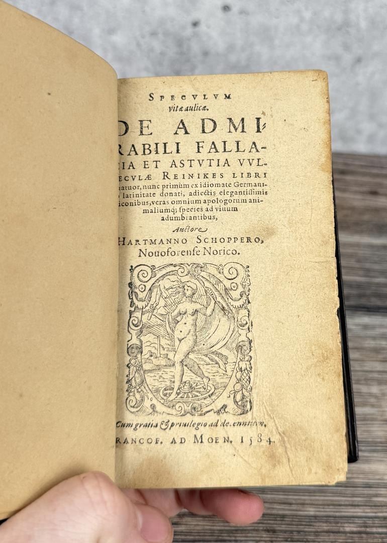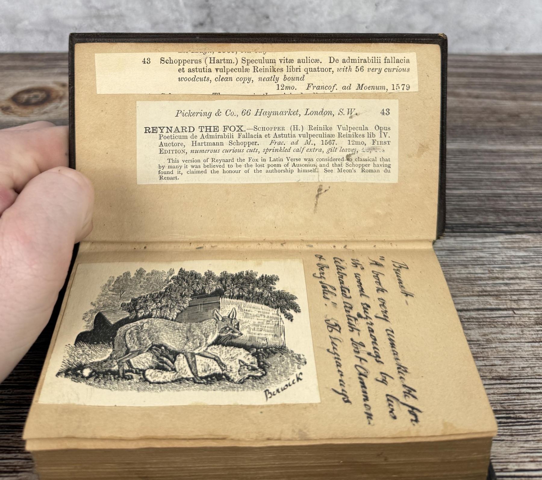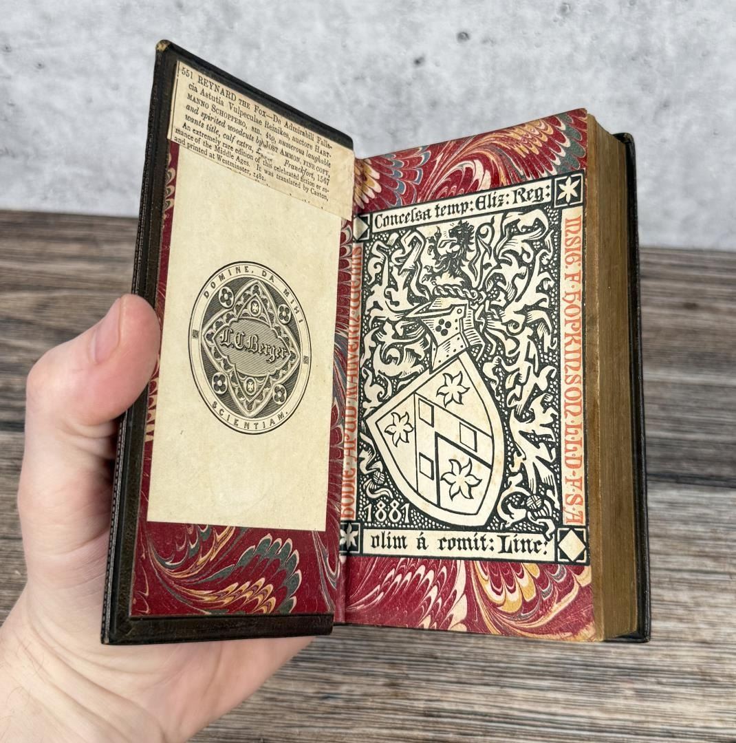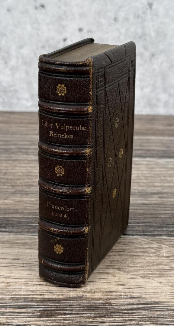 12mo (140 x 83 mm). Woodcut printer's device on title, with 57 woodcut illustrations (from 51 blocks) by Jost Amman in text. (Some soiling to title-page, small wormhole to margin of A1-A3.) 19th century morocco, covers with geometric designs in blind, four fleuron devices with diamond designs, spine in 5 compartments with 5 raised bands, gilt-lettering in 2, fleuron centerpieces in others, all edges gilt (light rubbing to joints). Provenance: L.C. Berger (bookplate); F. Hopkinson (bookplate); early dealer or auction clippings tipped in; manuscript notation quoting Brunet's description of this work; underlining and some marginalia in a contemporary hand. Speculum vitae aulicae de admirabili fallacia et astutia vulpeculae Reinikes. 1584 FOURTH EDITION of Schopper's Latin translation of the popular German beast epic narrating the adventures of Reynard the Fox. The Medieval Reynard cycle evolved out of Flemish and Dutch versions and was first published in Low German in 1498. Schopper's Latin version, originally issued in 1567, made the stories available to a pan-European audience. This edition is especially noteworthy for its charming series of 57 woodcuts by the German master Jost Amman, which make their first appearance here. Menke, Bibliotheca Reinardiana Bb5; STC German (BL London) 735. Selections from the Library of Dr. John Talbot Gernon