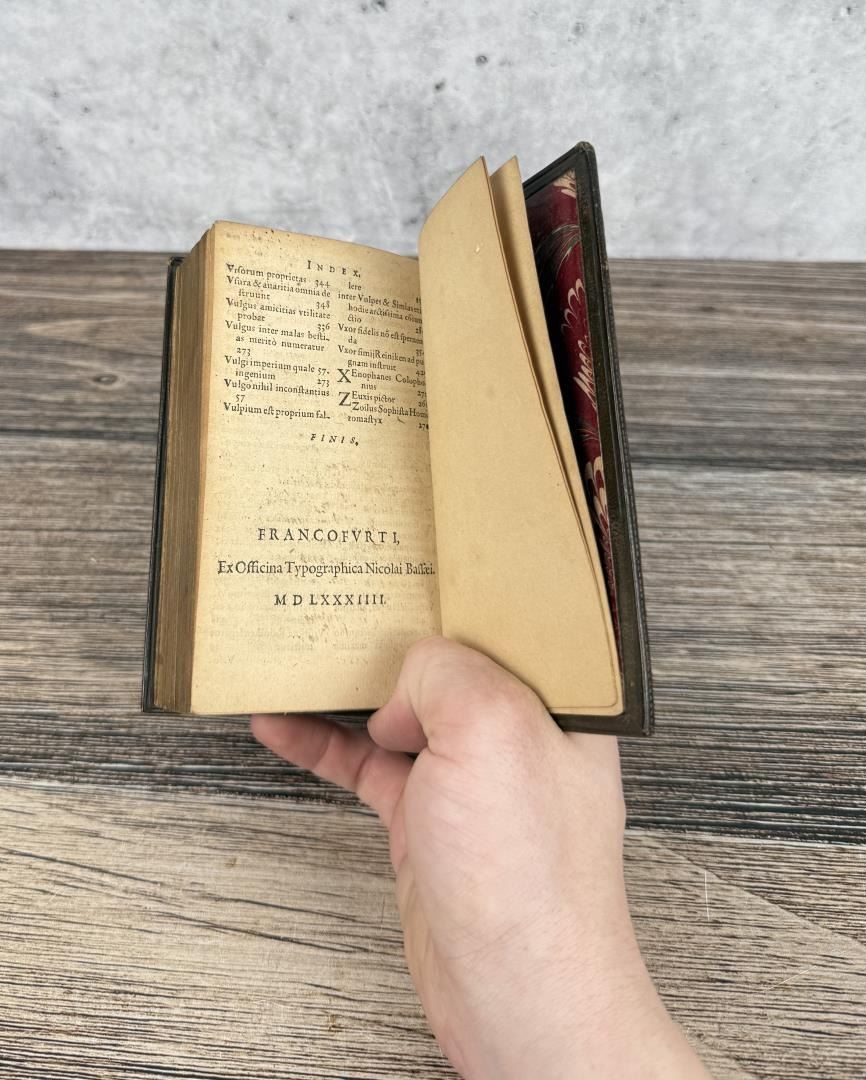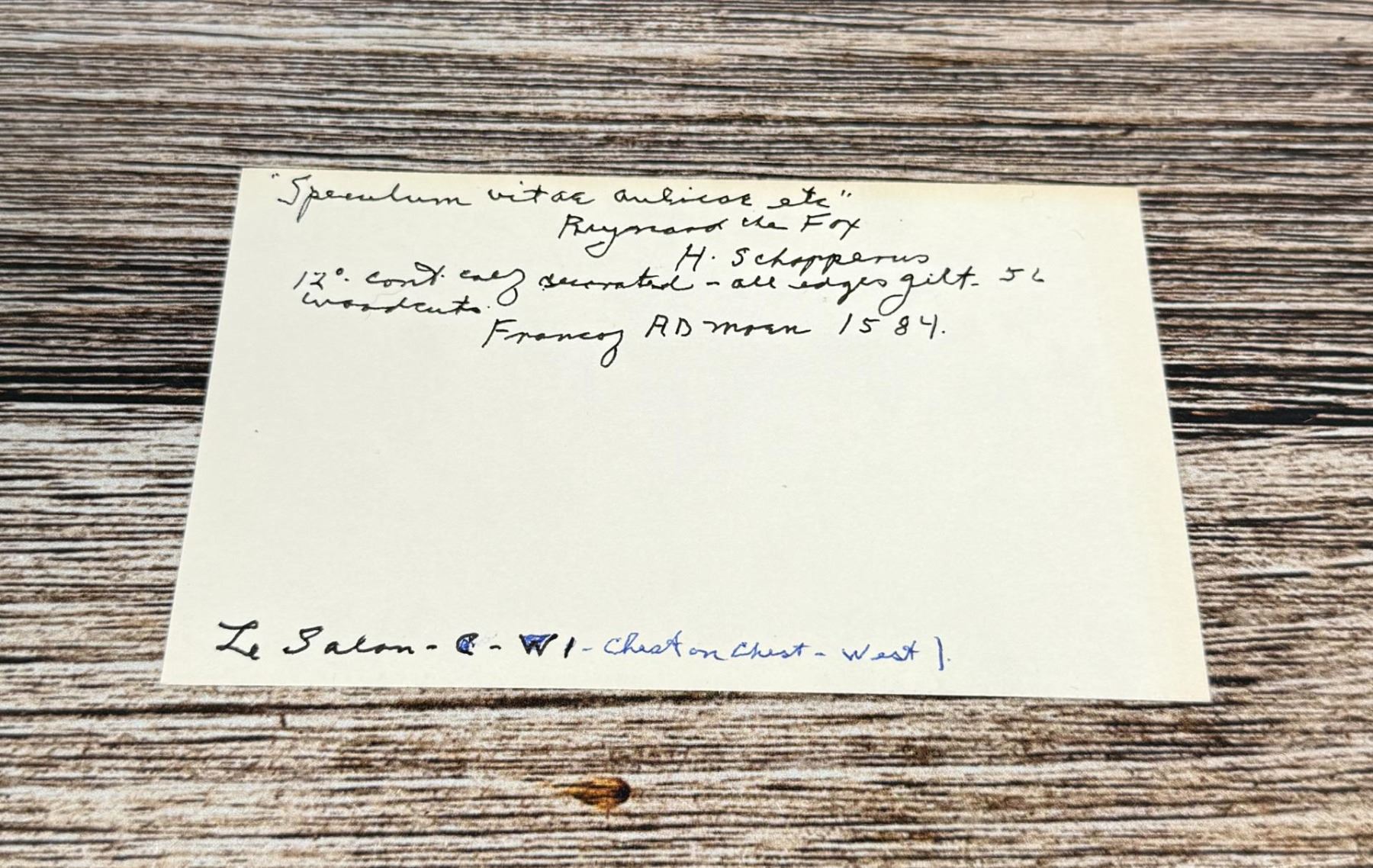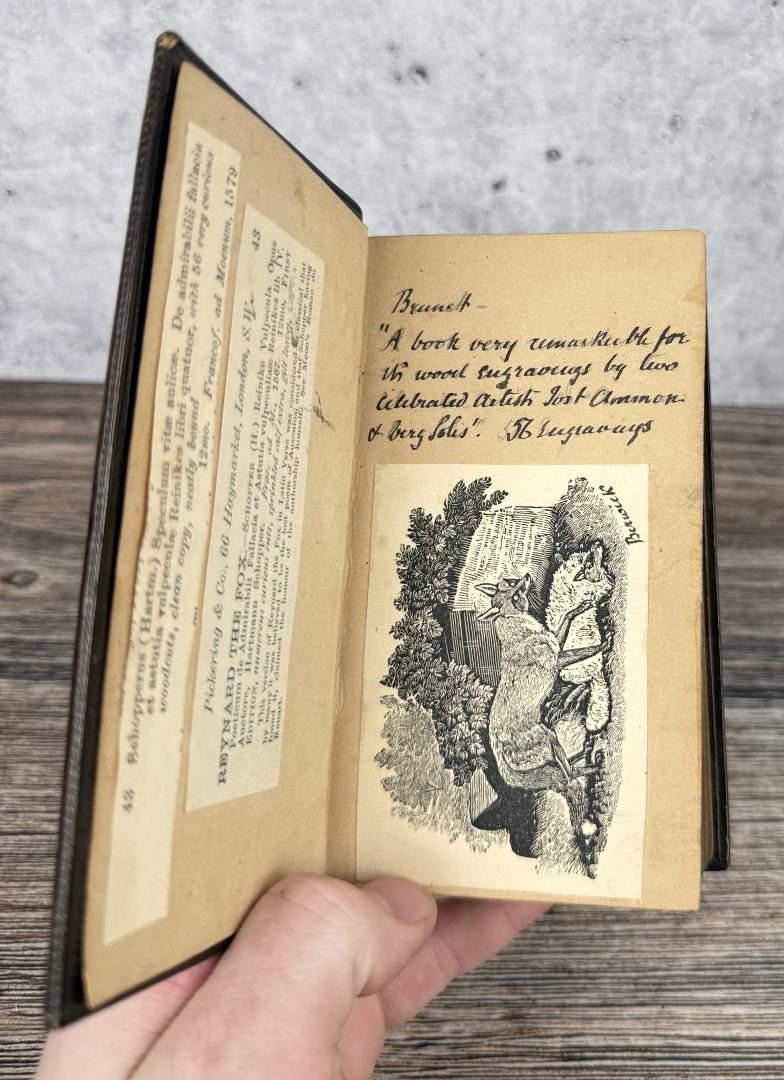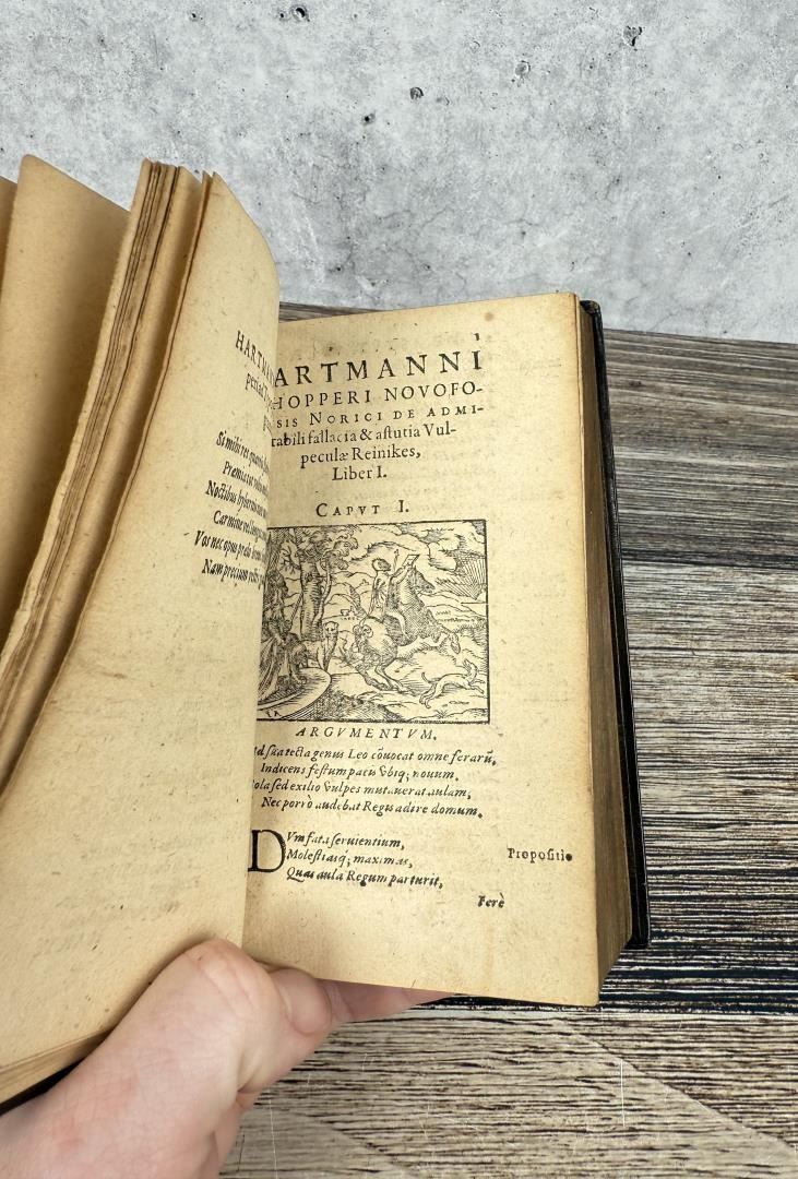 12mo (140 x 83 mm). Woodcut printer's device on title, with 57 woodcut illustrations (from 51 blocks) by Jost Amman in text. (Some soiling to title-page, small wormhole to margin of A1-A3.) 19th century morocco, covers with geometric designs in blind, four fleuron devices with diamond designs, spine in 5 compartments with 5 raised bands, gilt-lettering in 2, fleuron centerpieces in others, all edges gilt (light rubbing to joints). Provenance: L.C. Berger (bookplate); F. Hopkinson (bookplate); early dealer or auction clippings tipped in; manuscript notation quoting Brunet's description of this work; underlining and some marginalia in a contemporary hand. Speculum vitae aulicae de admirabili fallacia et astutia vulpeculae Reinikes. 1584 FOURTH EDITION of Schopper's Latin translation of the popular German beast epic narrating the adventures of Reynard the Fox. The Medieval Reynard cycle evolved out of Flemish and Dutch versions and was first published in Low German in 1498. Schopper's Latin version, originally issued in 1567, made the stories available to a pan-European audience. This edition is especially noteworthy for its charming series of 57 woodcuts by the German master Jost Amman, which make their first appearance here. Menke, Bibliotheca Reinardiana Bb5; STC German (BL London) 735. Selections from the Library of Dr. John Talbot Gernon
