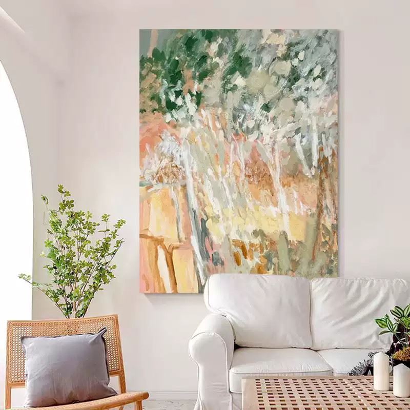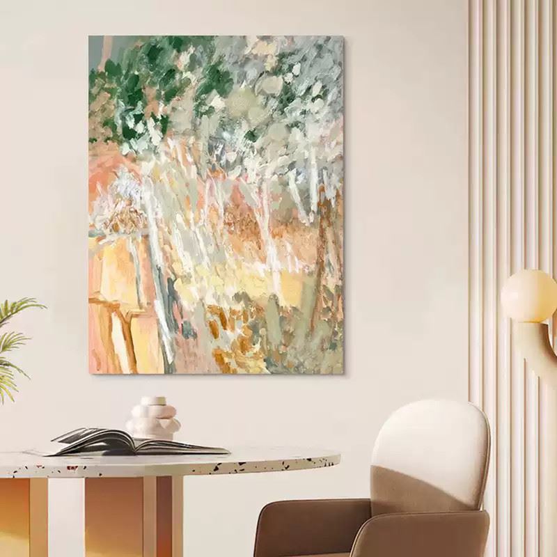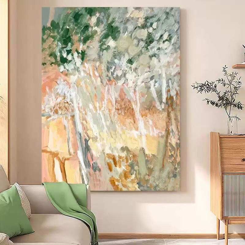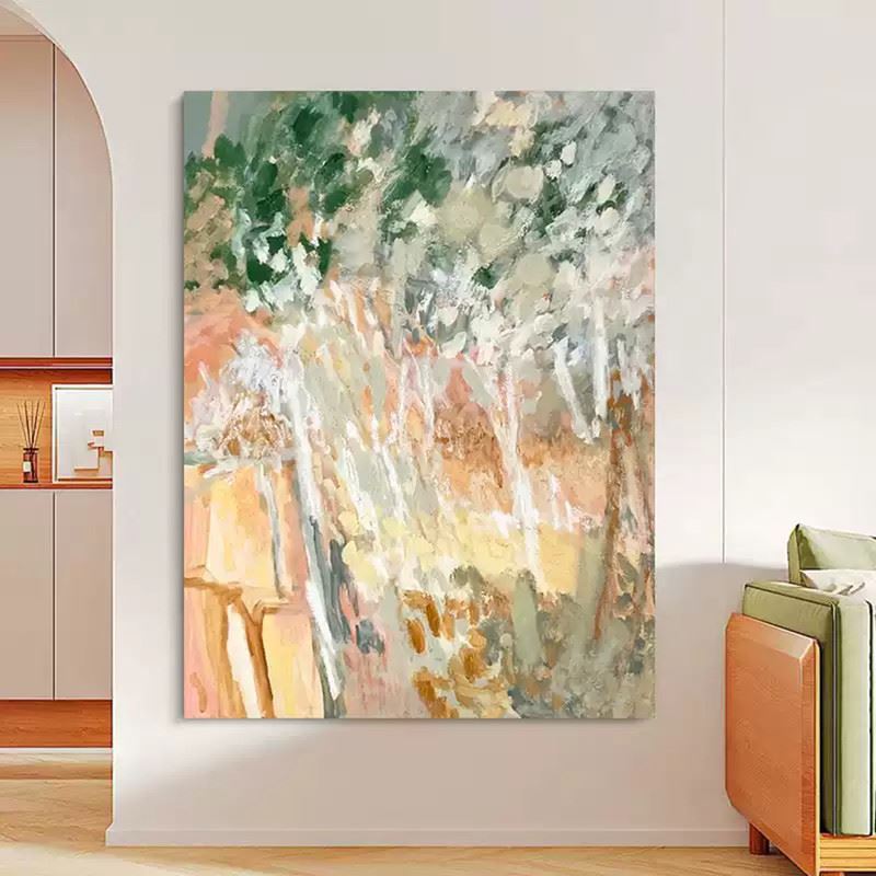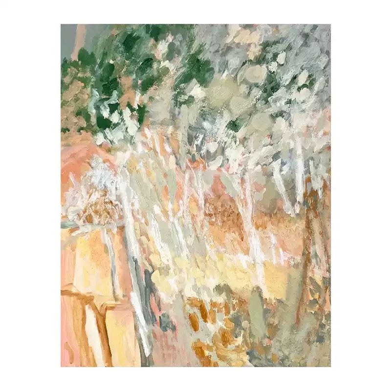 This artwork uses soft colors and delicate brushstrokes to depict a serene natural scene. The subtle blending of greens, yellows, and pinks evokes the fresh, tranquil atmosphere of a morning by the Rhine River. Dimensions: 24 x 31 inches.