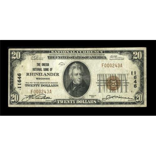 <B>Rhinelander, WI</B></I> - $20 1929 Ty. 1 <B>The Oneida NB</B></I> Ch. # 11646<BR> This is an evenly circulated note from the gateway to the north woods of Wisconsin. <B>Fine</B></I>.<BR><I>From The Kansas City Collection.</B></I><BR><BR><b>Shipping:</b> Coins & Currency (<a target="_blank" href="http://www.heritageauctions.com/common/shipping.php">view shipping information</a>)