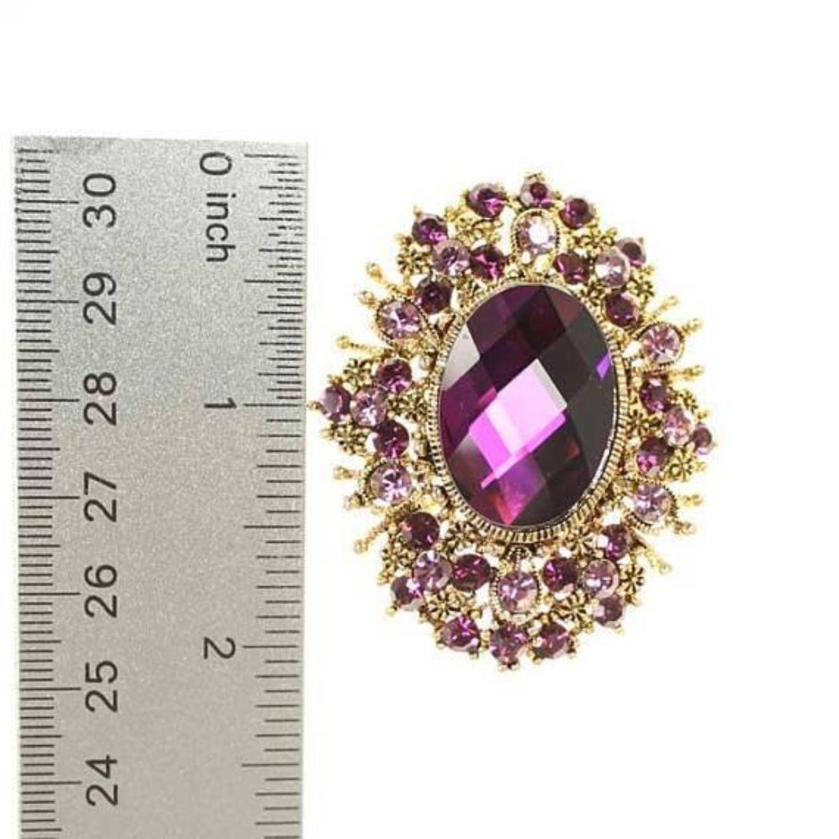 Description Purple Broach. This Amazing Amethyst Purple Brooch Crystal Jewelry Component. Quantity: 1 Pc Size: Approximately 2"h X 1 3/4"w Inches Base: Alloy Metal Plating: Antique Gold Tone - 10049C-032418-ES-14179