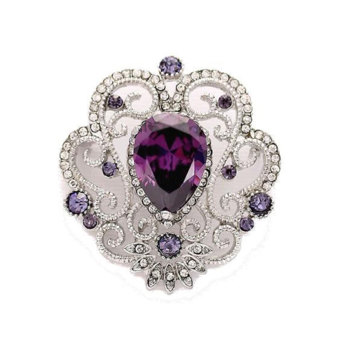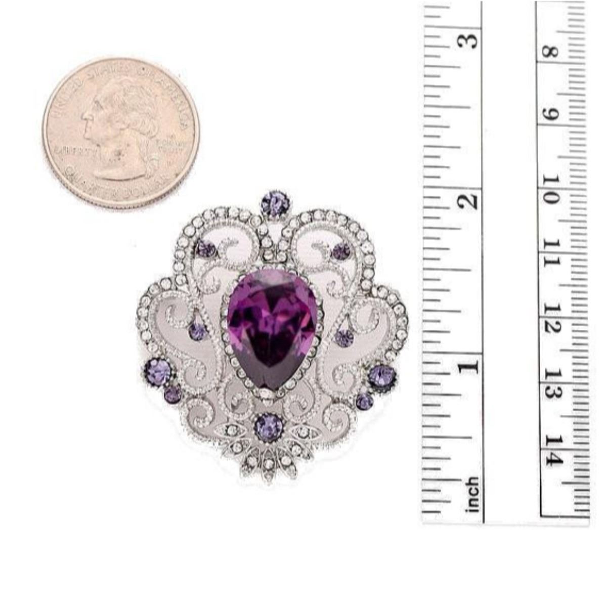 Description Beautiful crystal purple brooch Vintage Victorian wedding bridal jewelry embellishment, which can be used for your DIY project - purple wedding bridal brooch bouquet, necklace, bracelet, ring pillow, invitations, cake decorations, event decor, crafts, scrap booking and much more! Size: 1 5/8 inch high 1 1/2 inches wide Stone color: Crystal clear, purple, lilac Metal: Silver This purple rhinestone brooch can be ordered as a flat back embellishment for your sew-on, glue-on DIY project or with a pin in the back to add to wedding gown or dress sash, to wire into brooch bouquet, or any number of other craft project. - 10045-032418-ES-14177