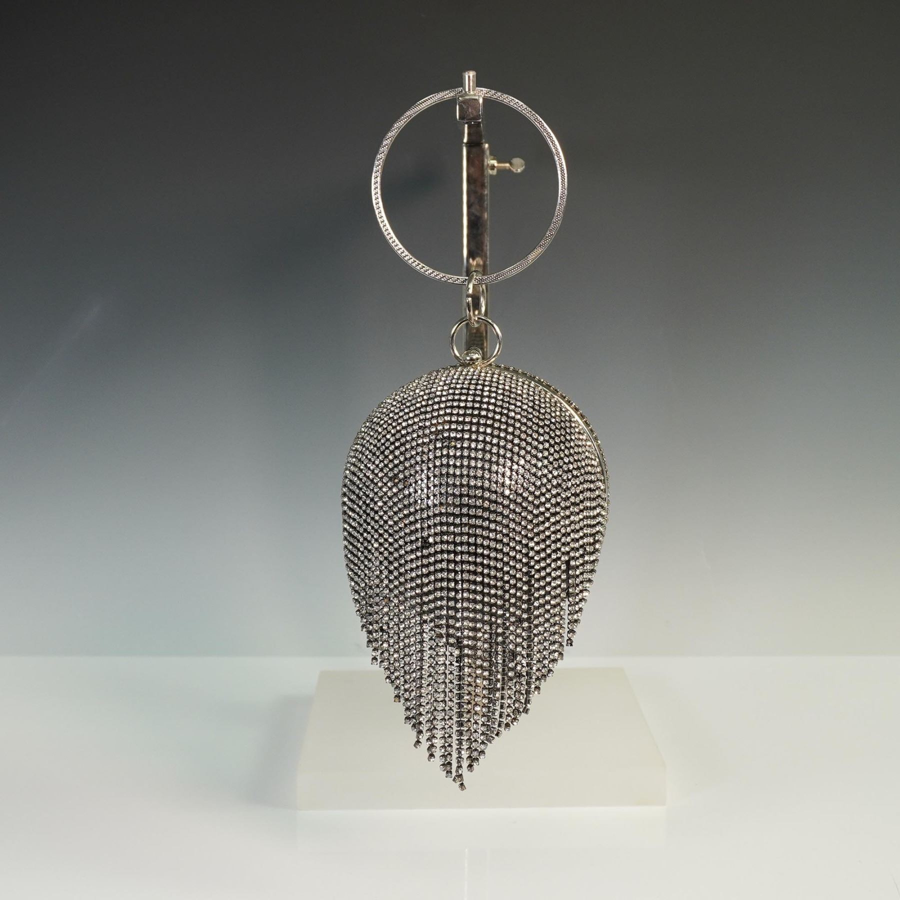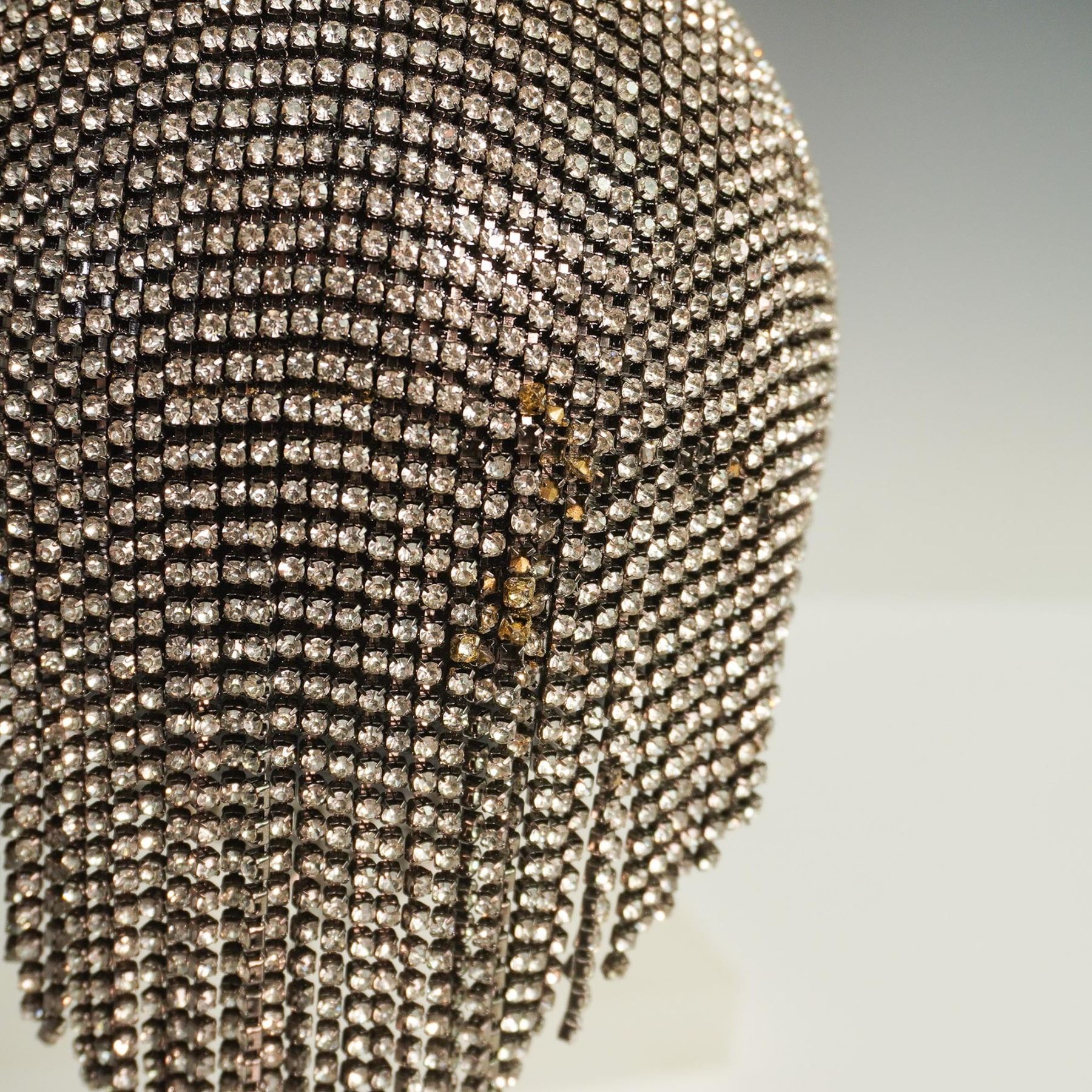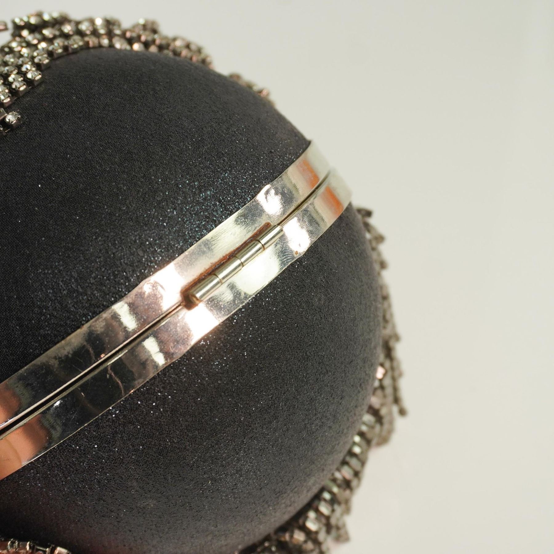 Dramatic rhinestone-encrusted sphere minaudiere evening bag featuring a draped chain fringe design and a rhinestone-studded ring handle. The hinged structure opens to a black satin-lined interior with a clasp closure. While designer is unmarked, the piece reflects the style of couture evening bags known for their sculptural forms and crystal embellishments. Some discoloration and residue are visible on a portion of the exterior rhinestones. Measures 5"L x 5.5"H excluding handles.