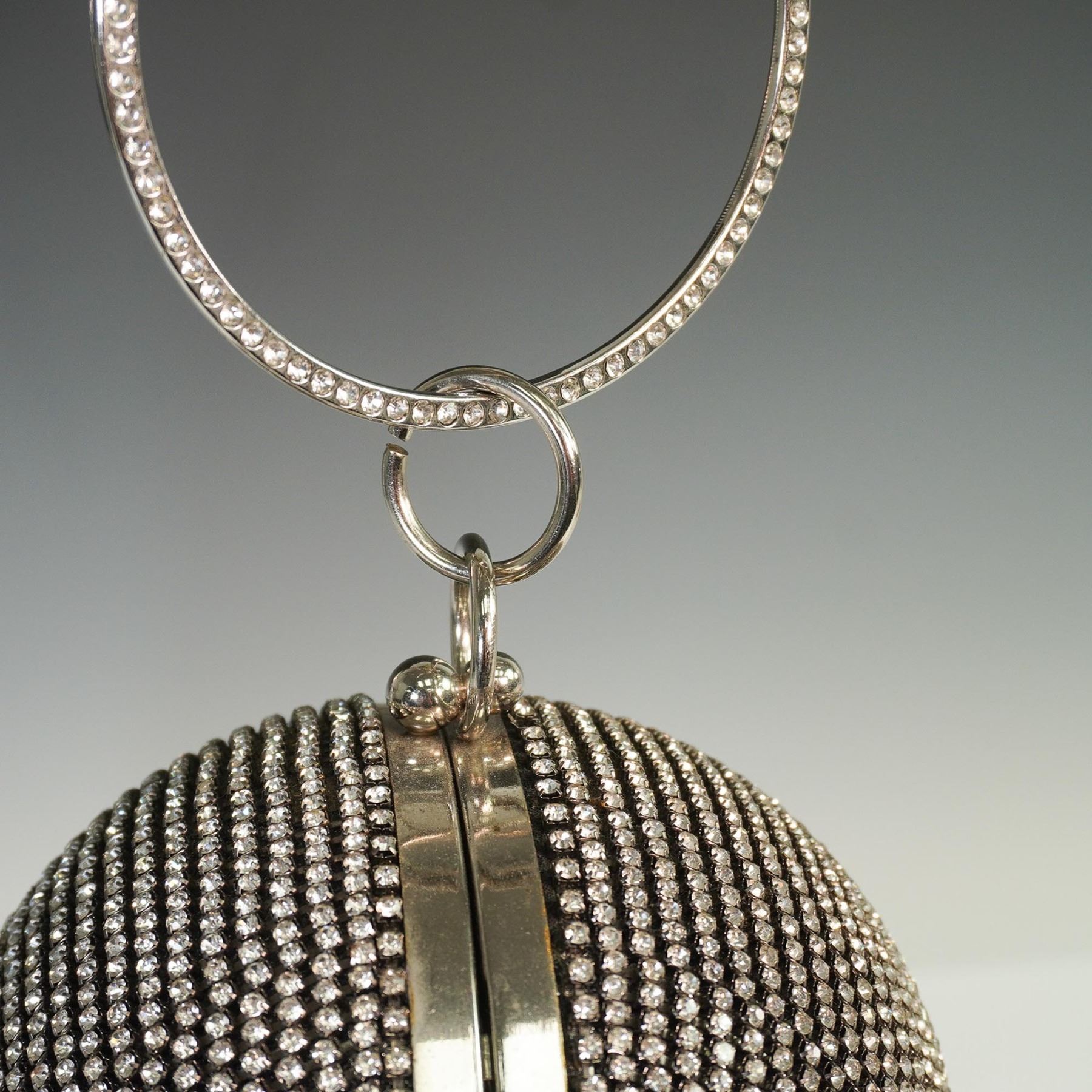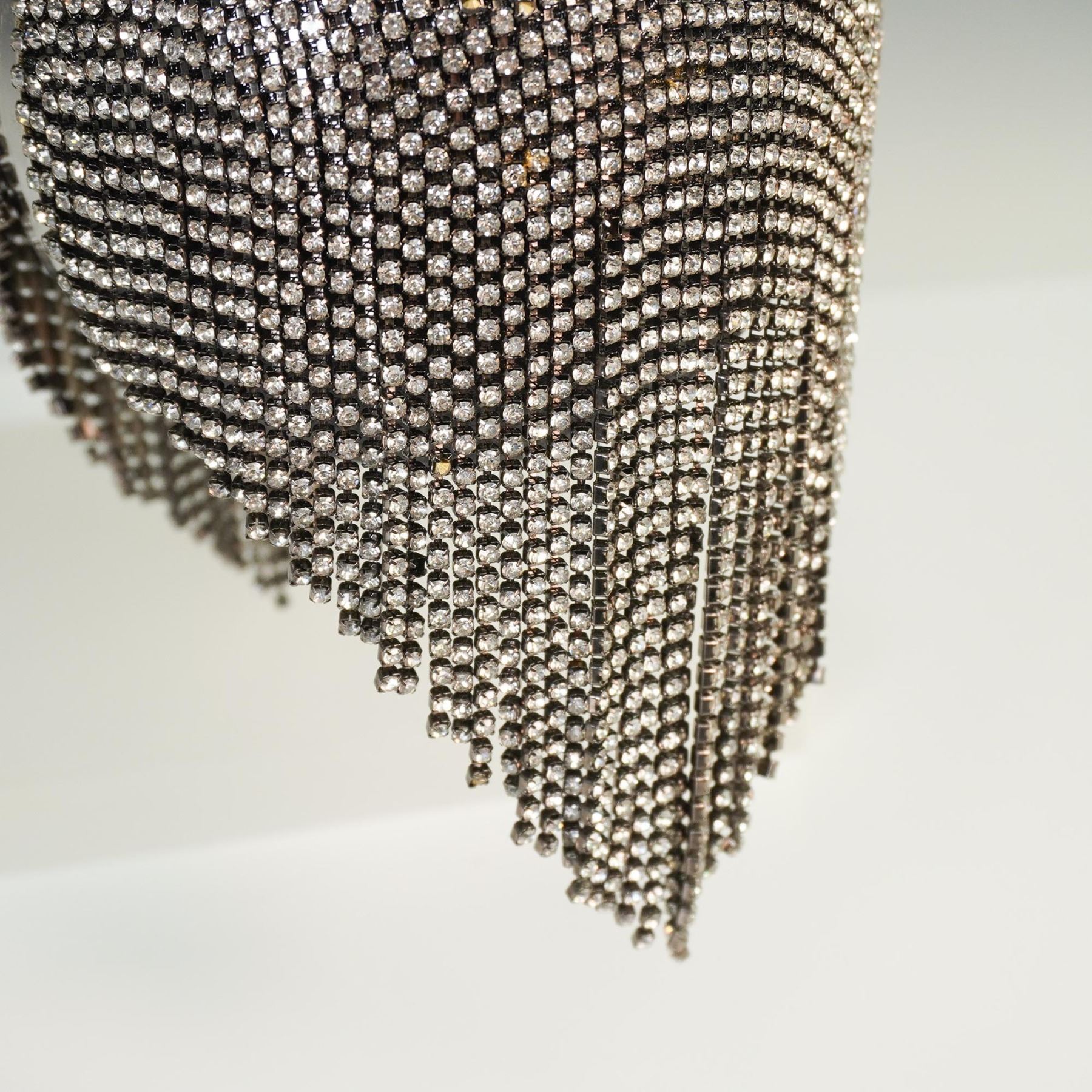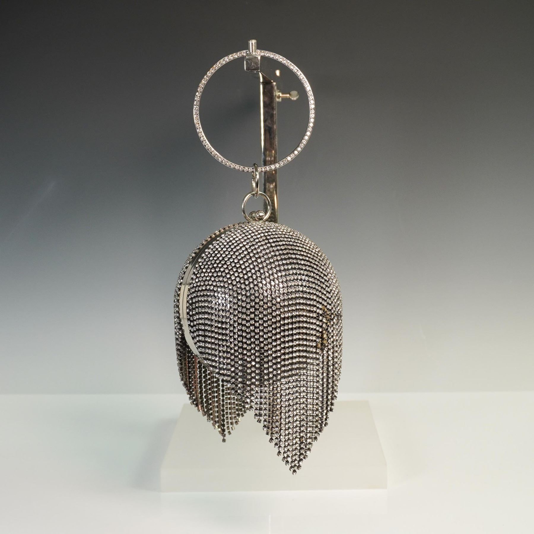 Dramatic rhinestone-encrusted sphere minaudiere evening bag featuring a draped chain fringe design and a rhinestone-studded ring handle. The hinged structure opens to a black satin-lined interior with a clasp closure. While designer is unmarked, the piece reflects the style of couture evening bags known for their sculptural forms and crystal embellishments. Some discoloration and residue are visible on a portion of the exterior rhinestones. Measures 5"L x 5.5"H excluding handles.
