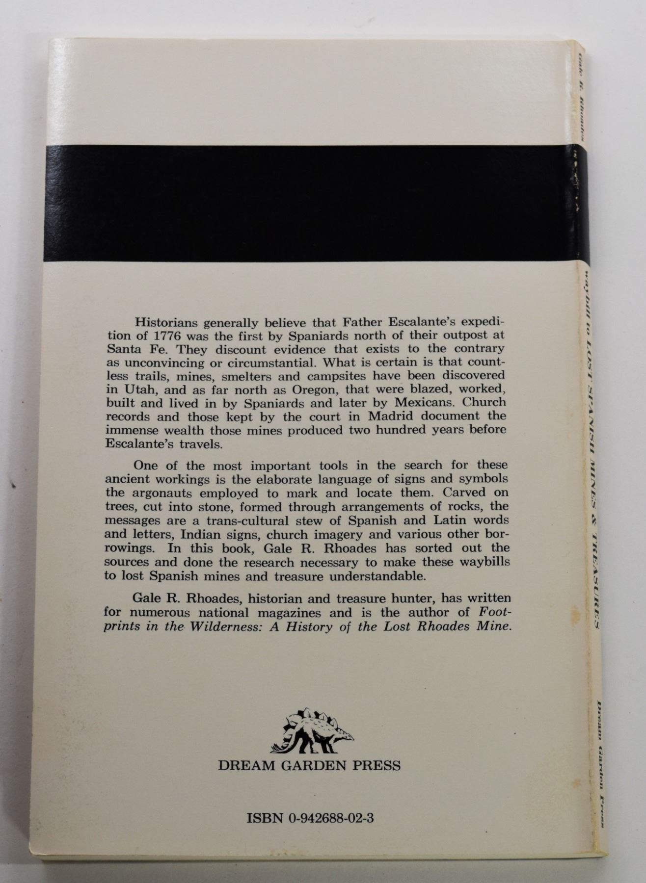 Rhoades, Gail R. WAYBILL TO LOST SPANISH MINES AND TREASURES. Dream Garden Press. 1982. 12mo, 97 pages; Softcover; This book is an important tool to use in the search for the ancient signs and symbols the argonauts employed to mark and locate their trails, mines, smelters and campsites. Carved on trees, cut into stone, formed through arrangements of rocks, the messages are a trans-cultural stew of Spanish and Latin words and letters, Indian signs, church imagery and various other borrowings. In this book, the author has sorted out the sources and done the reseaarch necessary to make these waybills to lost Spanish mines and treasure understandable. Subject: History - Buried Treasure