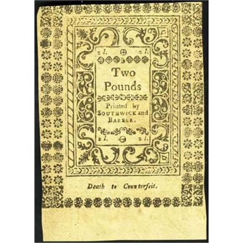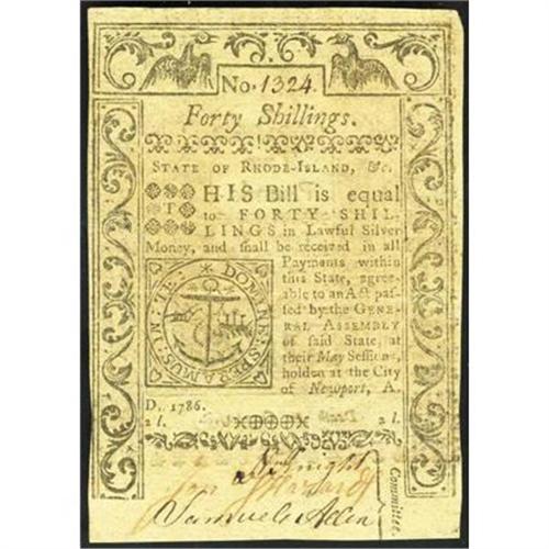 <b>Rhode Island. 40 Shillings Colonial currency. Choice Crisp Unc.</b> May 1786 session note with anchor on front, TWO POUNDS (=40 shillings) in fancy border on back. An attractive note, trimmed slightly close in areas.