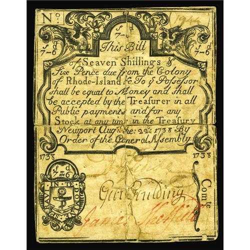 <B>Rhode Island August 22, 1738 7s/6d Very Fine Backed.</B></I> No example of any denomination from this incredibly rare issue was offered in the massive Stack's May 2004 offering of the Ford Collection. The issue was represented only by a lot of six reprints. This is a genuine issued example grading fully Very Fine in appearance although it is split in both directions and contemporarily backed. All three signatures are clear and bold. The note has been signed by Daniel Updike, George Goulding (both in brown), and James Sheffield (in red). The survival of an unfaded red signature for almost 275 years approaches miraculous. Every word of the text, as well as the seal and vignettes, are boldly printed and perfectly clear. This note has the word 'Seven' in the denomination misspelled "Seaven." Virtually impossible to estimate, but very likely the one and only opportunity to obtain a genuine example of this note that any collector will have in his lifetime.
