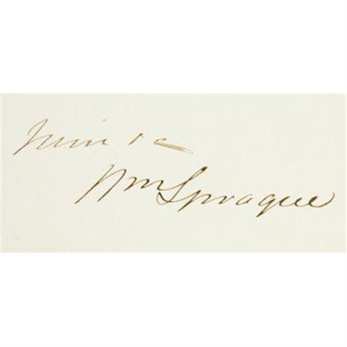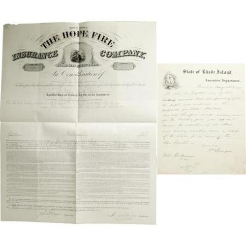 <B>Rhode Island Civil War Governor William Sprague ALS,</B></I> "<I>Wm Sprague</B></I>", one page on official letterhead, 7.75" x 9.75", Providence, Rhode Island, September 9, 1862, to General E. C. Warren, sending instructions regarding printing. Very fine condition.<BR>Included is a partly-printed Hope Fire Insurance Policy, one page with docketing, 13.75" x 17.75", New York, February 1, 1871. This document has a wonderful engraved vignette of the Rhode Island seal with anchor. Very fine condition. <I>From the collection of Henry E. Luhrs.</B></I><BR><BR><b>Shipping:</b> Flat Material, Small (<a target="_blank" href="http://www.heritageauctions.com/common/shipping.php">view shipping information</a>)