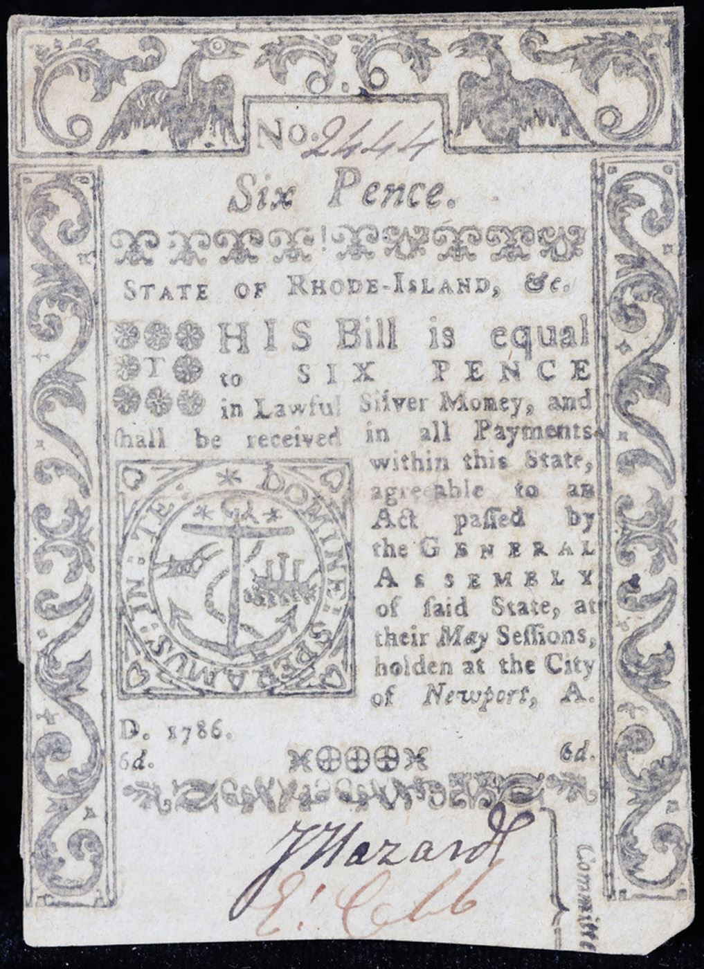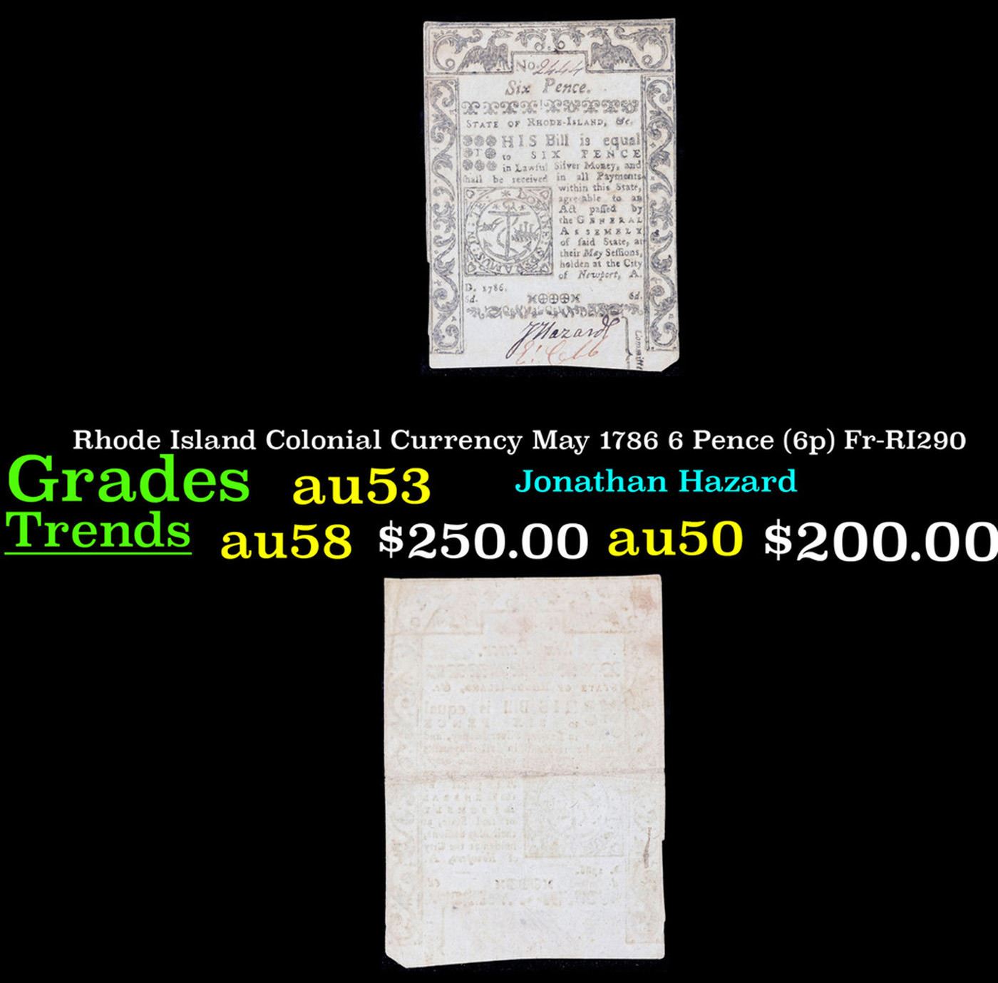 Rhode Island Colonial Currency May 1786 6 Pence (6p) Fr-RI290 Grades Select AU.