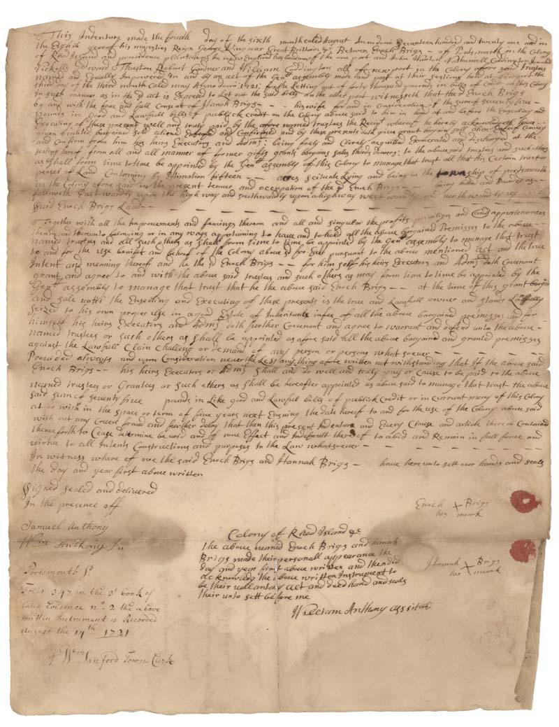 Manuscript Document. One page, 12 3/4” x 15 7/8”. Portsmouth, Rhode Island. August 4, 1721.The document is an indenture between Enoch Briggs of Portsmouth in the Colony of Rhode Island and providence plantations in New England husbandman of the one part and … Trustees named and especially empowered in and by and act of the Genl. Assembly … “ concerning a estimated fifteen acres of land. Some toning. Splits at folds. Overall Fine.