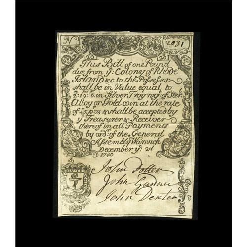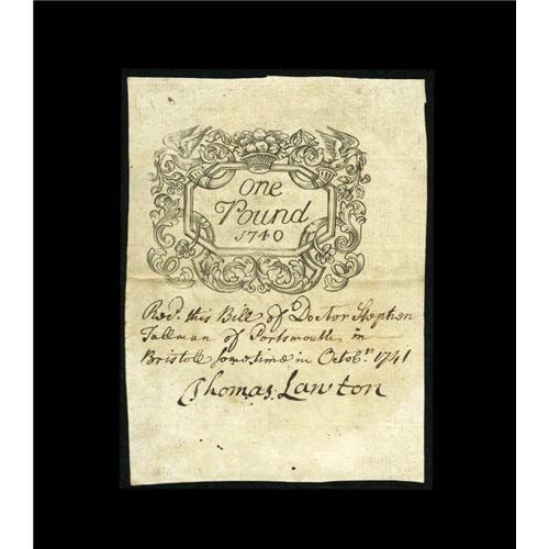 <B>Rhode Island December 2, 1740 Contemporary Counterfeit 1L About New.</B></I> This note was previously lot 568 from Stack's May 11, 2004 sale of the John Ford Collection. It's one of the few known examples of this issue and denomination, all of which, to the best of our knowledge, are counterfeits from this same source. The counterfeiter was Dr. Stephen Tallman, who was the brother-in-law of John Potter who was one of the authorized signers of this issue. Tallman was exposed, arrested, and tried, and although no direct connection was ever made, some suspicion fell on John Potter as a possible accomplice of his brother-in-law. Contemporary endorsement on the back of this bill reads: "rec'd this Bill of Dr. Stephen Tallman of Portsmouth in Bristol sometime in Octob. 1741 (signed) Thomas Lawton." The bill shows only very minor traces of circulation and has a single horizontal fold. There is no splitting, staining, aging, or restorations of any kind. With no genuine examples available, and with the fascinating history behind this early note, we would expect it to well exceed the $9,200 it realized a year and a half ago.
