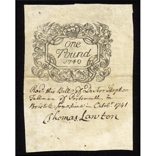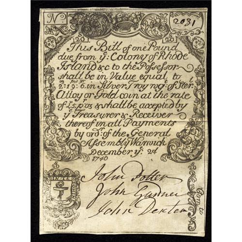 <B>Rhode Island December 2, 1740 Contemporary Counterfeit £1 About New.</B></I> This note was previously lot 568 from the May 2004 sale of the John Ford Collection. It's one of the few known examples of this issue and denomination, all of which, to the best of our knowledge, are counterfeits from the same source. The counterfeiter was Dr. Stephen Tallman, who was the brother-in-law of John Potter, one of the authorized signers of this issue. Tallman was exposed, arrested, and tried, and although no direct connection was ever made, some suspicion fell on John Potter as a possible accomplice of his brother-in-law. Contemporary endorsement on the back of this bill reads: "rec'd this Bill of Dr. Stephen Tallman of Portsmouth in Bristol sometime in Octob. 1741 (signed) Thomas Lawton." The bill shows only very minor traces of circulation and has a single horizontal fold. There is no splitting, staining, aging, or restorations of any kind. With no genuine examples available and with the fascinating history behind this early note, we would expect it to well exceed the $9,200 it realized over three years ago.<BR><BR><b>Shipping:</b> Coins & Currency (<a target="_blank" href="http://www.heritageauctions.com/common/shipping.php">view shipping information</a>)