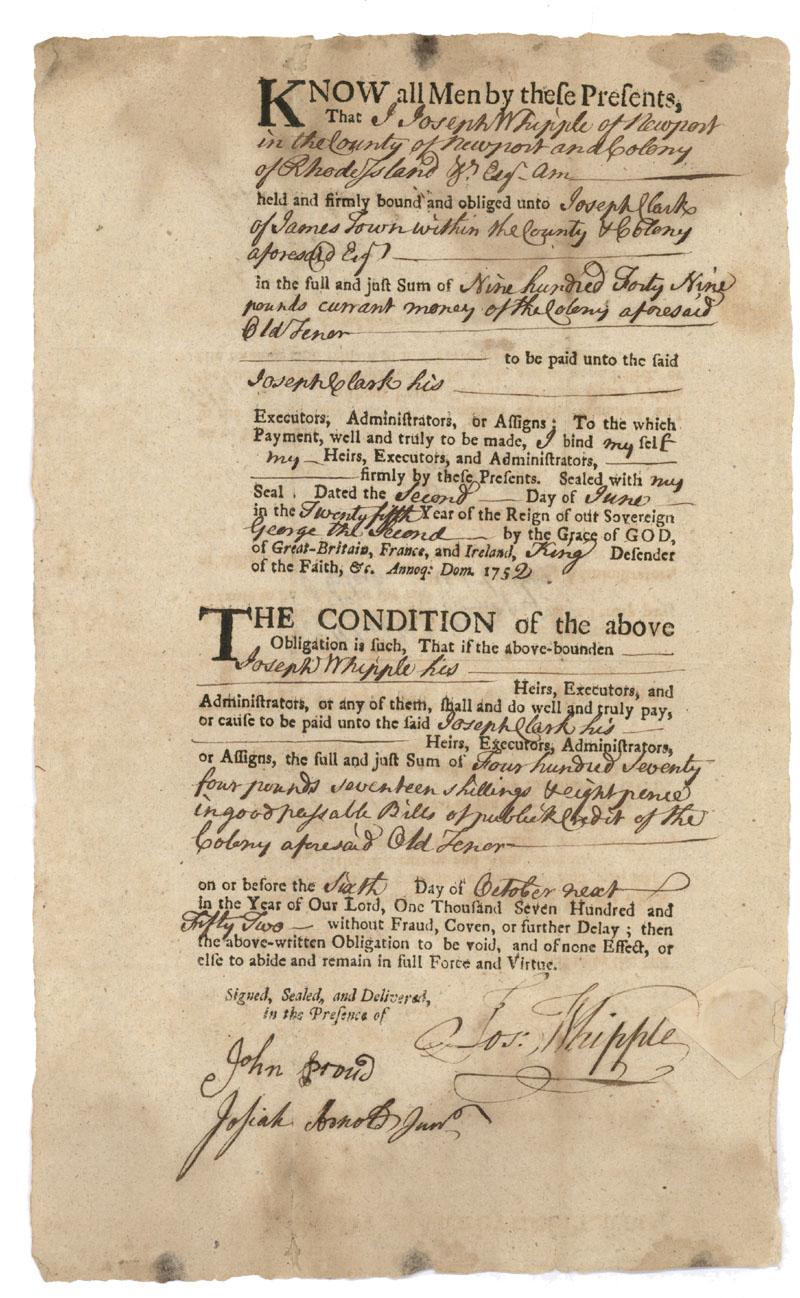 JOSEPH WHIPPLE III. DS. 1 page. 7 ½” x 12 ½”. June 25, 1752. Partly-printed bond in which “Joseph Whipple of Newport in the County of Newport in the Colony of Rhode Island am held and firmly bound to Joseph Clark of James Town within the County & Colony aforesaid in the full and just sum of nine hundred forty nine pounds currenc money of the Colony aforesaid Old Tenor…” Some dampstaining. A rare colonial Rhode Island autograph signed while serving as Deputy Governor.