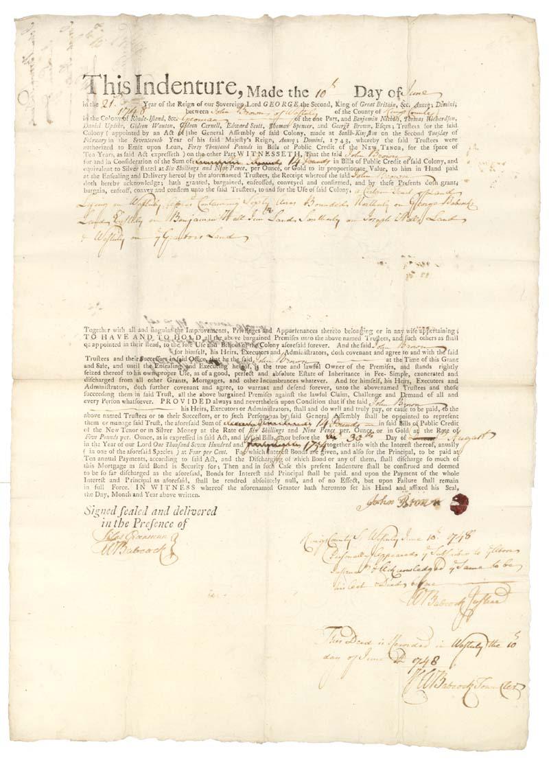 Partially Printed Indenture. One page, 12 1/8” x 16 1/2”. Kings County. June 10, 1748. The document is an indenture between John Brown and the Trustees of the Rhode Island Colony in the amount of 75 Pounds, corrected to 14 Pounds, for “ … a certain tract of land lying in Westerly … Containg sixty acres bounded Northerly on George Babcocks land Eastern on Benjamin Halls Junr. Land Southerly on Joseph Halls Land & Westerly on ye Grantors Land … ” The document is signed by WILLIAM BABCOCK (1708-1751) Babcock served as town clerk of Westerly for a period of about twenty years. Babcock was also a justice of the peace and represented Westerly in the General Assembly of Rhode Island in 1744. In addition, the document notes that it was “Signed, Sealed and Delivered in the Presence of both Babcock and SILAS GREENMAN (1690-1760) Justice of the peace from Kingston. In 1718, Greenman was found guilty of counterfeiting, which led to his removal from his post. Greenman went on to serve as Town Councilor, clerk and moderator for Westerly, Rhode Island. Greenman was also a slave holder who estate inventory included seven slaves. Usual folds. Extremely Fine.