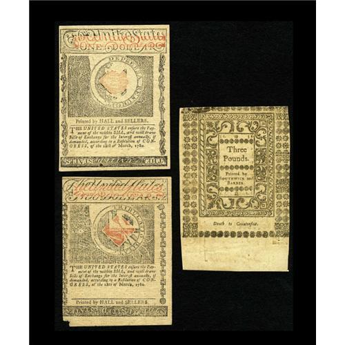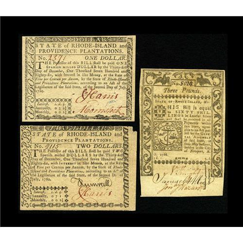 <B>Rhode Island July 2, 1780 $1; $2 About New, missing corner tip; New</B></I><BR><B>Rhode Island May 1786 <$3 XF.</B></I><BR>Three bright notes in this lot.<BR><I>From The Plymouth Rock Collection</B></I>