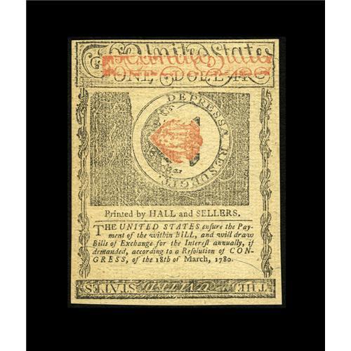 <B>Rhode Island July 2, 1780 $1 Choice New.</B></I> A pristine note that is kept from Gem by uneven margins.