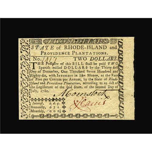 <B>Rhode Island July 2, 1780 $2 Gem New.</B></I> This is a perfect remainder, fully signed on the face, but with an unsigned guarantee on the back.<BR><BR><b>Shipping:</b> Coins & Currency (<a target="_blank" href="http://www.heritageauctions.com/common/shipping.php">view shipping information</a>)