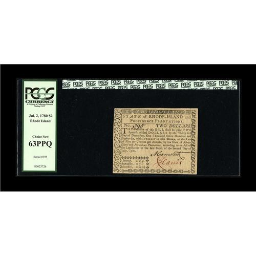 <B>Rhode Island July 2, 1780 $2 PCGS Choice New 63PPQ.</B></I> A crisp and well embossed example from this popular Rhode Island issue which is only kept from a higher grade by a tight left margin.