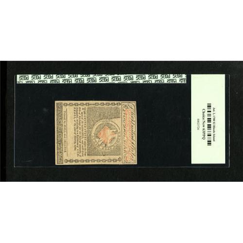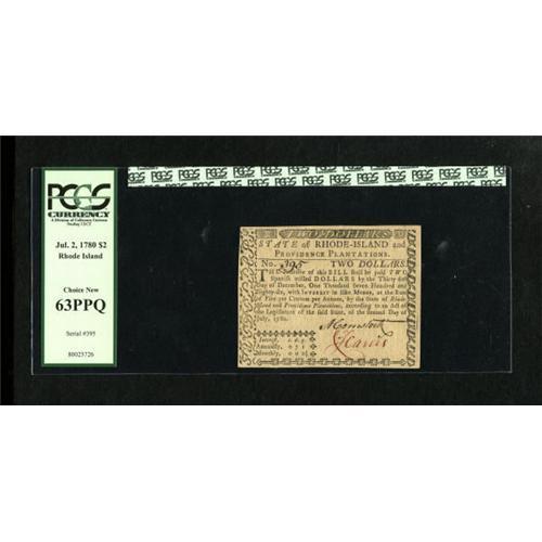 <B>Rhode Island July 2, 1780 $2 PCGS Choice New 63PPQ.</B></I> This is a well embossed example from this popular Rhode Island issue which is only kept from a higher grade by a tight left margin. Both signatures are bold, too.<BR><BR><b>Shipping:</b> Coins & Currency (<a target="_blank" href="http://www.heritageauctions.com/common/shipping.php">view shipping information</a>)
