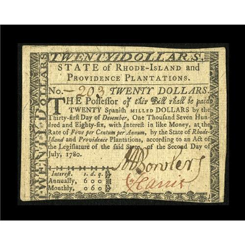 Rhode Island July 2, 1780 $20 Choice About New. A cente Rhode Island July 2, 1780 $20 Choice About N