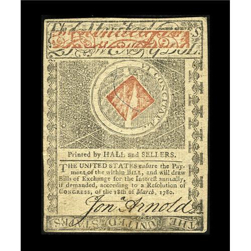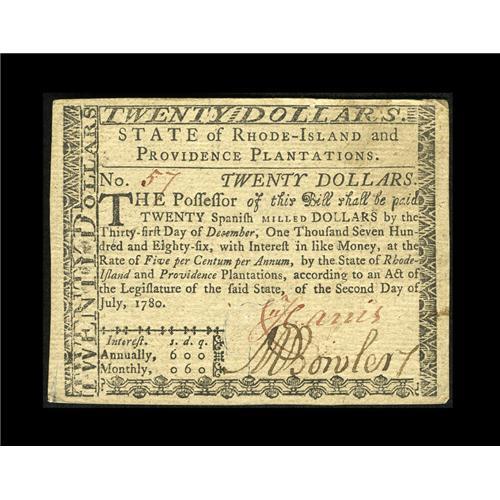 <B>Rhode Island July 2, 1780 $20 Choice New.</B></I> Nice color, signatures, and margins on this note that has a couple of pinholes.<BR><BR><b>Shipping:</b> Coins & Currency (<a target="_blank" href="http://www.heritageauctions.com/common/shipping.php">view shipping information</a>)