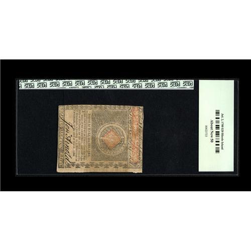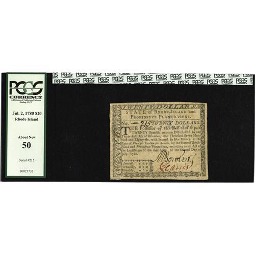 <B>Rhode Island July 2, 1780 $20 PCGS About New 50.</B></I> Very well margined and fully signed on both sides. In unsigned Remainders, all denominations of these Rhode Island Guaranteed notes have the same value. But fully signed, issued notes go up in value as the denomination increases. This is not due to numismatic rarity but rather to the vague but possible notion that these notes may prove to be redeemable along with five percent interest since 1780. This $20 is by far the highest denomination ($8 is the second highest), and when fully signed examples are available, they tend to bring very strong prices.<BR><I>From The Troy Wiseman Collection</B></I>