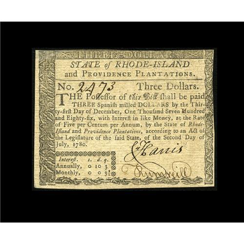 Rhode Island July 2, 1780 $3 Extremely Fine-About New. Rhode Island July 2, 1780 $3 Extremely Fine-A