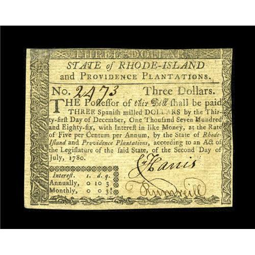 <B>Rhode Island July 2, 1780 $3 Extremely Fine-About New.</B></I> This note should grade New, however, an expertly repaired upper left corner must be noted.<BR><BR><b>Shipping:</b> Coins & Currency (<a target="_blank" href="http://www.heritageauctions.com/common/shipping.php">view shipping information</a>)