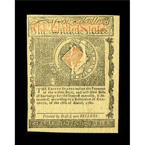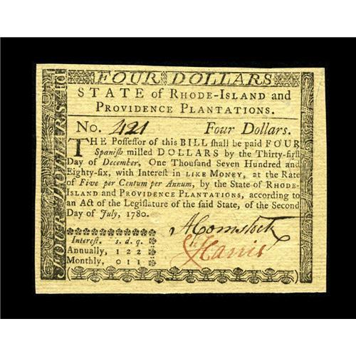 <B>Rhode Island July 2, 1780 $4 Choice New.</B></I> This is a very common issue, but generally found as a remainder with the guarantee on the back unsigned, as this note is. Strong signatures remain on the face.<BR><BR><b>Shipping:</b> Coin/Currency (<a target="_blank" href="http://www.heritageauctions.com/common/shipping.php">view shipping information</a>)