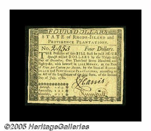 <B>Rhode Island July 2, 1780 $4 Choice New.</B></I> This is a very common issue, but generally found as a remainder with the guarantee on the back unsigned. This high-grade example is fully signed and issued.