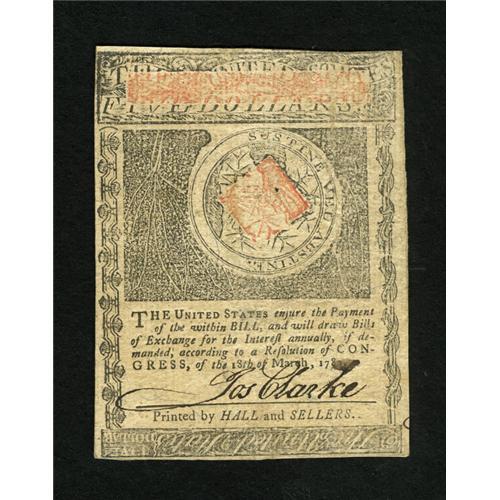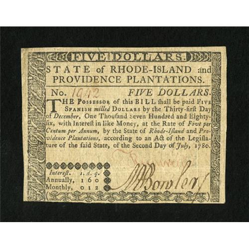 <B>Rhode Island July 2, 1780 $5 About New.</B></I> A lateral center fold is detected on this note.<BR><BR><b>Shipping:</b> Coins & Currency (<a target="_blank" href="http://www.heritageauctions.com/common/shipping.php">view shipping information</a>)