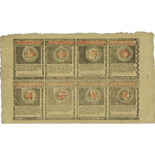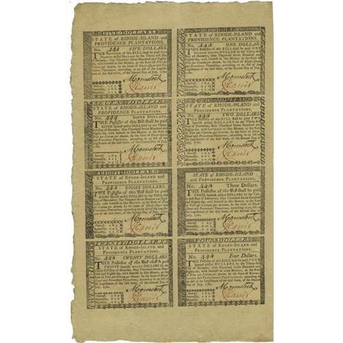 <B>Rhode Island July 2, 1780 Uncut Half Sheet of Eight $5, $1, $7, $2, $8,$3, $20, $4 Gem New.</B></I> These notes from sheet number 444 are boldly signed by Comstock and Harris on the face, but the backs lack the final guaranty signature. All eight notes in the sheet itself are pristine. <BR><BR><b>Shipping:</b> Coins & Currency (<a target="_blank" href="http://www.heritageauctions.com/common/shipping.php">view shipping information</a>)
