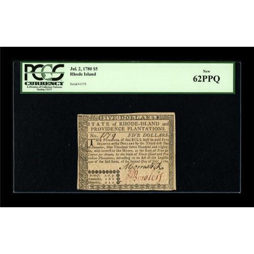 <B>Rhode Island July 2, 1780 $5 PCGS New 62PPQ.</B></I> The color is bright on this well centered Colonial.<BR><BR><b>Shipping:</b> Coins & Currency (<a target="_blank" href="http://www.heritageauctions.com/common/shipping.php">view shipping information</a>)