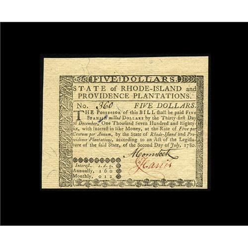 Rhode Island July 2, 1780 $5 Superb Gem New. The face h Rhode Island July 2, 1780 $5 Superb Gem New.