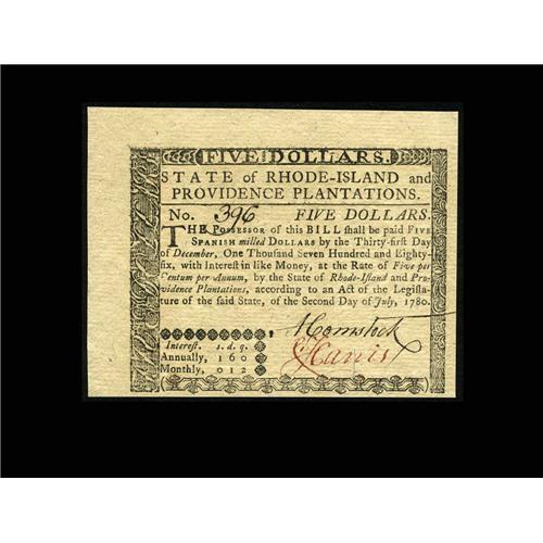 Rhode Island July 2, 1780 $5 Very Choice New. The face Rhode Island July 2, 1780 $5 Very Choice New.