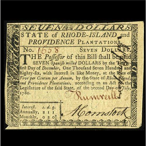 <B>Rhode Island July 2, 1780 $7 New.</B></I> The bottom corners show a small amount of handling.