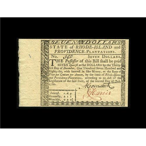 Rhode Island July 2, 1780 $7 Very Choice New. The back Rhode Island July 2, 1780 $7 Very Choice New.