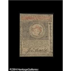 Rhode Island July 2, 1780 $8 Choice New. An uncance <B>Rhode Island July 2, 1780 $8 Choice New.</B></I> An uncancelled, fully issued Rhode Island Guaranteed note, signed on the back for the United States by J. Arnold. Additionally interesting as this is serial number 21, and we can't recall another low number note of this issue. <BR><BR><B>Important notice:</B> Heritage usually auctions material at the rate of 200-250 lots per hour. On some occasions eBay Live bid software or the Internet may not be able to keep up with the pace of the auction. We recommend placing a realistic absentee bid now as insurance to avoid disappointment. Occasionally the auctioneer may eliminate or reject an eBay Live bid, and the auctioneer may also reopen a lot after the close of the eBay live bidding (usually because we missed an audience bid), and may reject your bid even if it shows you as the winning bidder. By bidding via eBay Live, you agree that Heritage may award the lot to another bidder at its sole discretion under the circumstances described above or any other reasonable circumstances. Since eBay bids are not shown to us until we open the lot on the floor, we treat those bids just like floor bids. In most cases the floor responds before the eBay bid is presented to us, due to Internet lag time, so for consistency we have made it a policy that floor bids are always considered first over tie eBay live bids. Also please note that all Heritage lots purchased through eBay Live carry a 20% Buyer's Premium. Please make sure you read the Terms and Conditions before you bid. This lot is being auctioned in conjunction with a live floor auction by Heritage Galleries & Auctioneers. All final auction and invoice information will be supplied by Heritage Galleries & Auctioneers, and all other information should be considered preliminary. Lot:15273