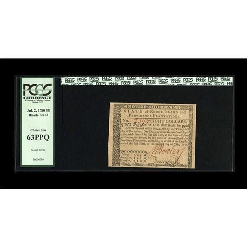 <B>Rhode Island July 2, 1780 $8 PCGS Choice New 63PPQ.</B></I> A scarcer fully signed note which is very well margined and appears to be a higher grade from the face.<BR><I>From The Troy Wiseman Collection</B></I>